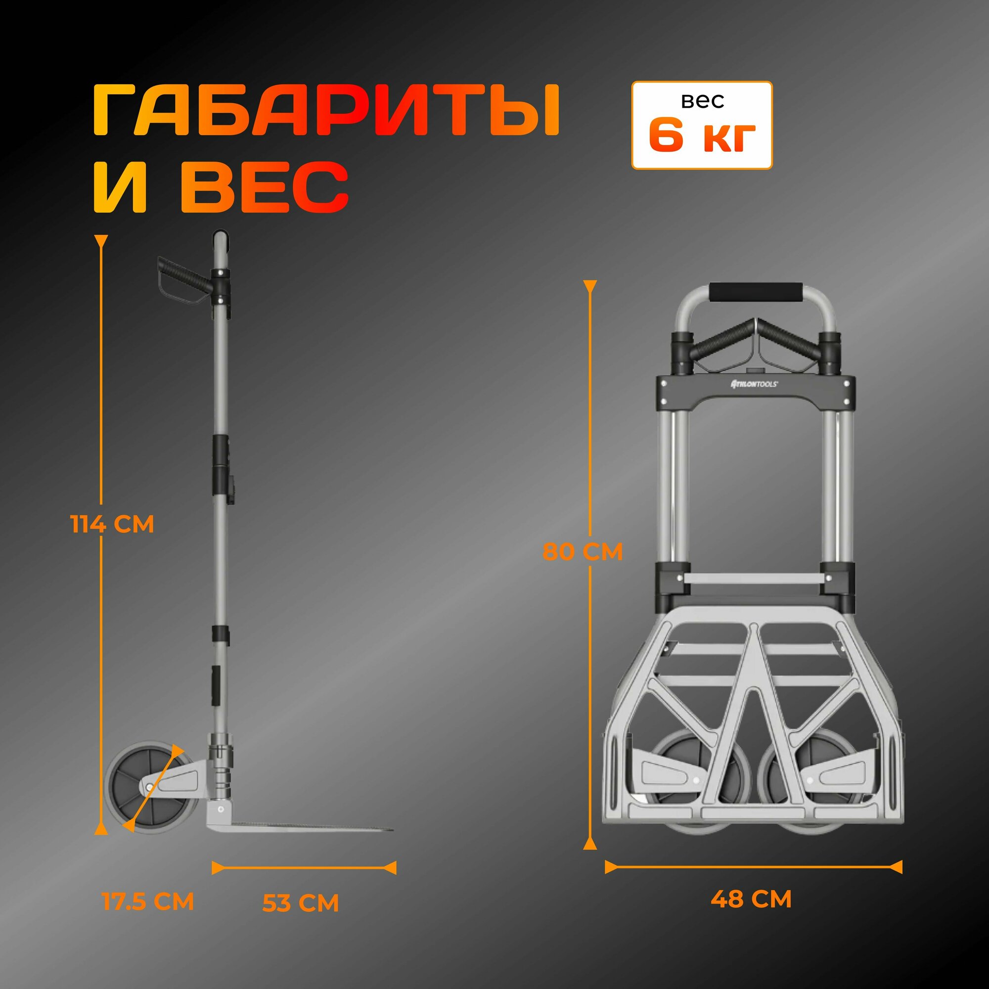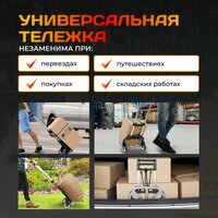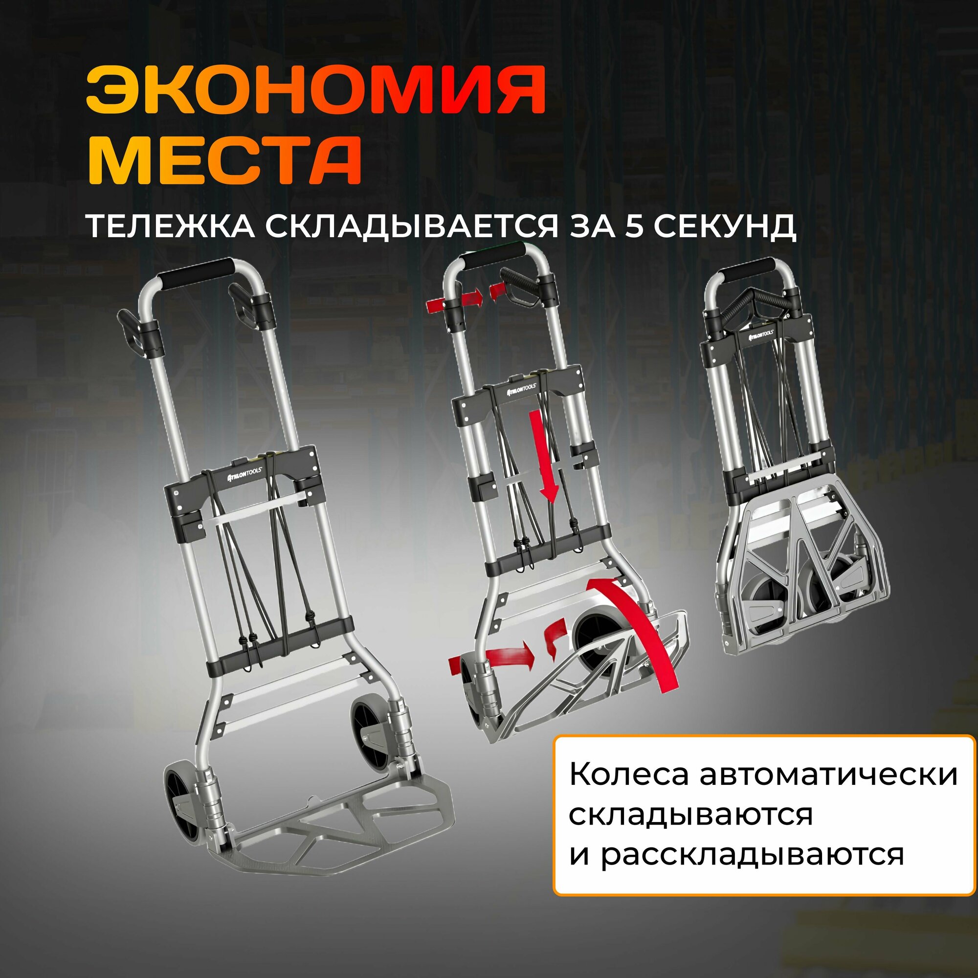 Эта тележка оснащена прочной рамой, способной выдерживать вес до 150 кг, что делает ее идеальным помощником для перевозки тяжелых предметов. Кроме того, у нее есть прочные колеса, позволяющие легко маневрировать даже по неровной поверхности.