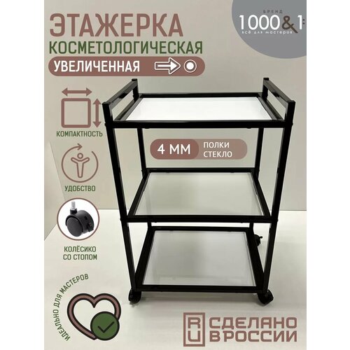 Прочная и удобная косметологическая тележка на колесах станет лучшей помощницей для косметолога, мастера маникюра, педикюра, наращивания ресниц, массажиста, визажиста, бровиста, тату-мастера, парикмахера. Расстояние между полками парикмахерской тележки 34см, сами полки снабжены бортиками для предотвращения скатывания баночек. У косметологического столика надежные поворотные колеса. Металлическая поверхность тумбы на колесиках устойчива к влаге, маслам и другим химическим веществам, и поэтому подойдет для салона красоты, парикмахерской, бьюти - коворкинга, дома, ванной комнаты, маникюрных и педикюрных кабинетов, наращивания ресниц, кабинетов перманентного макияжа и тату. Этажерка металлическая на колесах может использоваться как подставка полка для цветов, на кухню, в прихожую, в ванную.