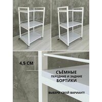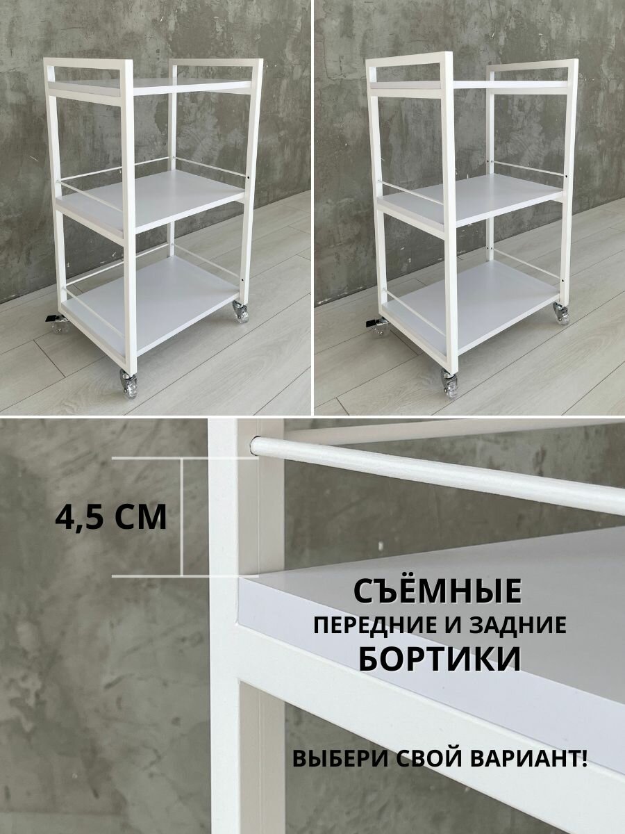 - Добавили возможность менять функционал и внешний вид с помощью легких съемных бортиков, подчеркивающих ее стиль. А также этажерку можно использовать без колес, в комплекте есть мягкие подпятники для защиты вашего пола.