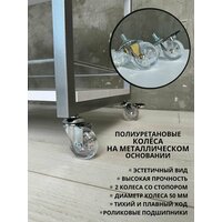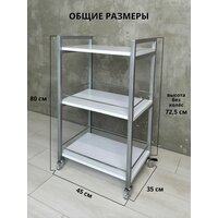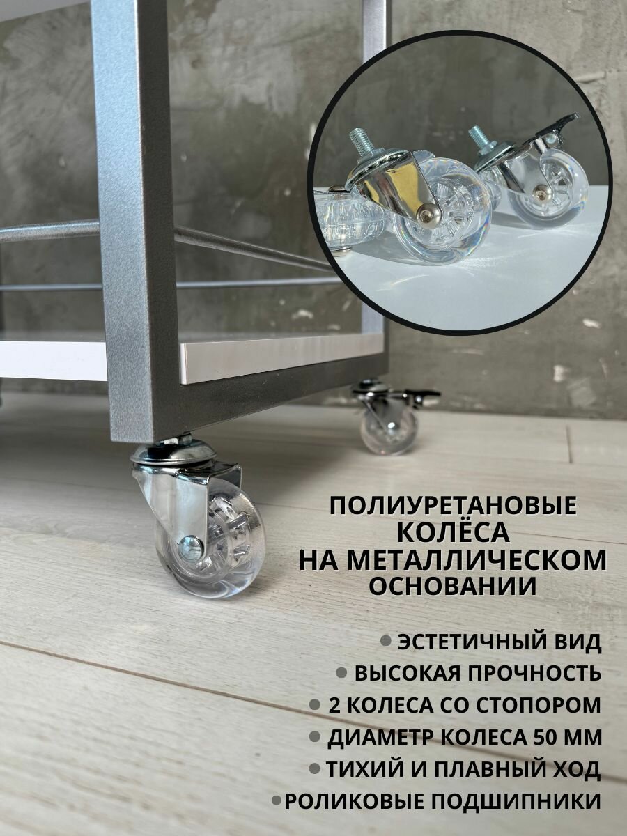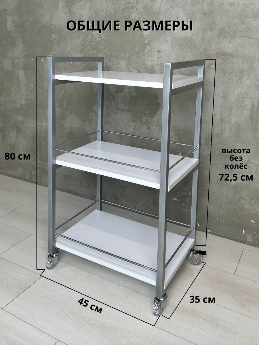 - 3 – ярусная металлическая конструкция оснащена надежными колесами из металла с тормозом, обеспечивающими плавный и тихий ход.