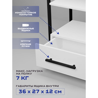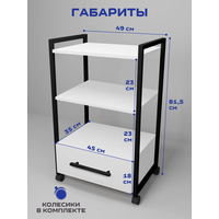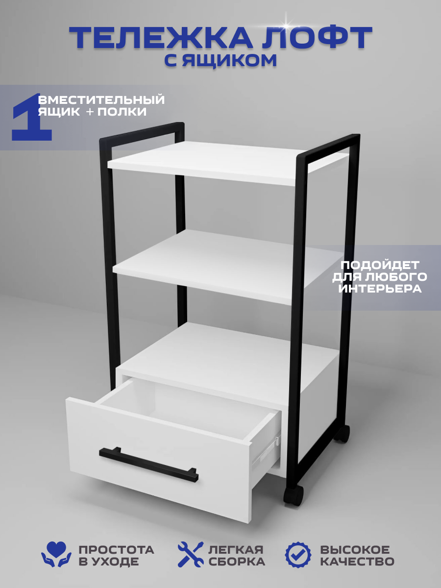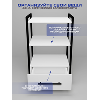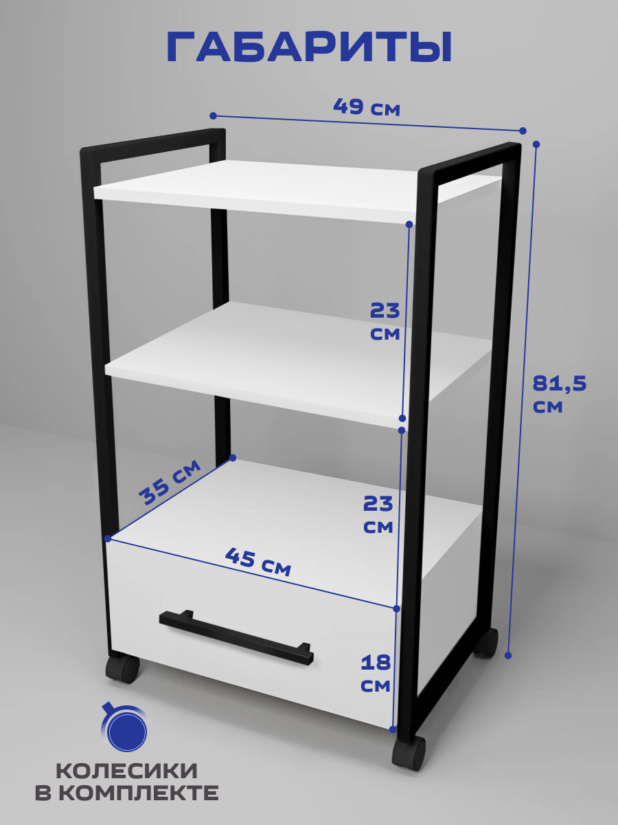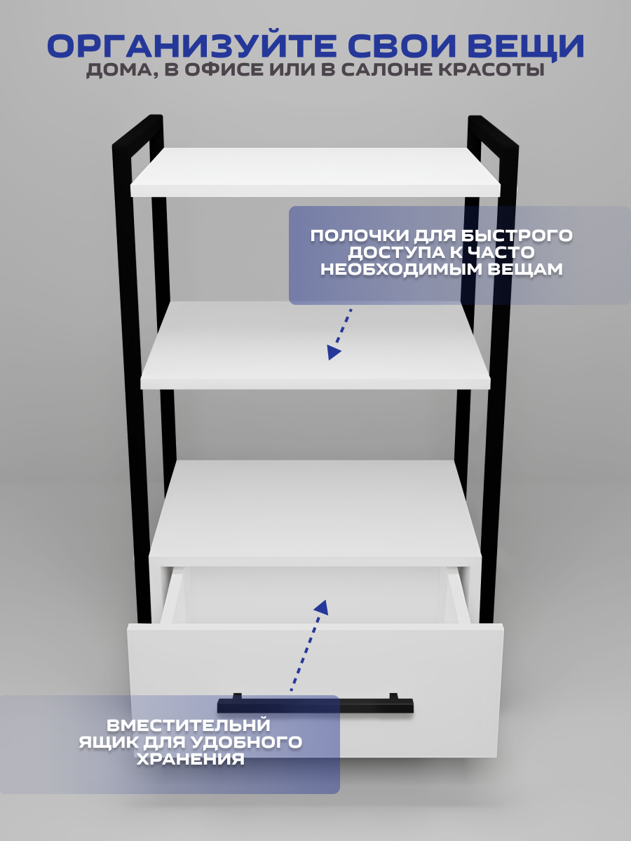 Представляем вам универсальное решение для вашего интерьера-этажерка- стеллаж с 1 ящиком, она сочетает в себе функциональность и прекрасный внешний вид, делая использование максимально удобным. Основным ее преимуществом является универсальность, что позволяет её использовать в различных пространствах – от ванны до салона красоты. В ванной комнате этажерка послужит отличным органайзером для полотенец, косметики и других необходимых принадлежностей. На кухне подойдет для хранения мелкой бытовой техники и как место для микроволновки. Система хранения в офисе обеспечит порядок для всех ваших документов, канцелярских принадлежностей, книг и оргтехники. Тележка косметологическая стала незаменимым помощником для многих парикмахеров, визажистов и косметологов их она привлекает своей мобильностью, надежной конструкцией и вместительностью. Благодаря своему дизайну и компактным размерам, она отлично вписывается в углы комнаты, максимально используя пространство. Этажерка металлическая имеет прочный металлический каркас, который окрашен порошковой окраской, что защищает от мелких царапин, а надежные полки из ЛДСП позволяют разместить на них большое количество предметов. Легкость сборки — это еще одно преимущество этой тележки. Таким образом, вы экономите свое время, не теряя при этом в качестве и функциональности. Если вы ищете мебель, сочетающую в себе функциональность и прекрасный внешний вид, то наша этажерка стеллаж– ваш идеальный выбор.
