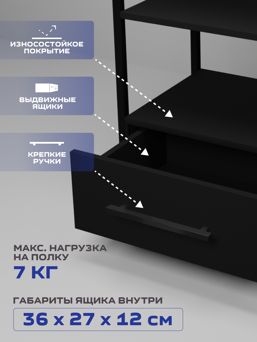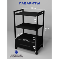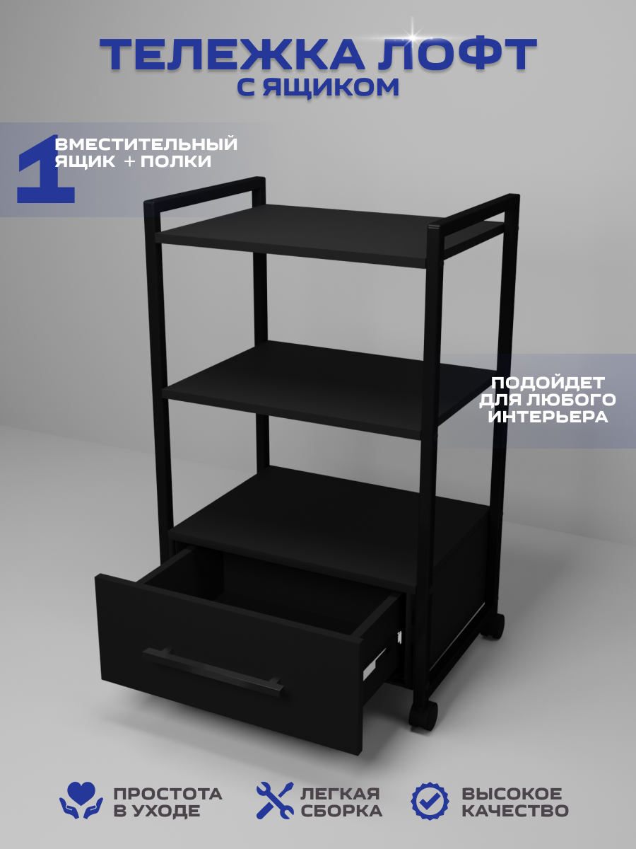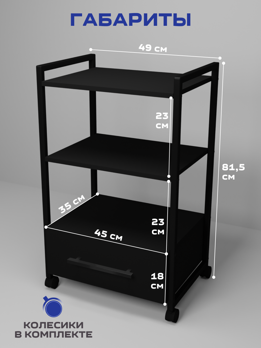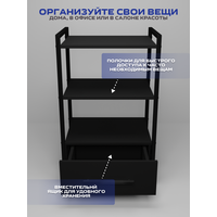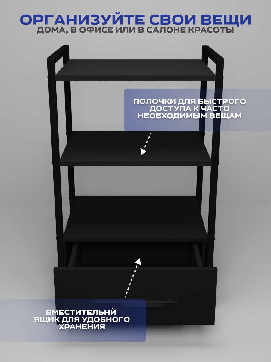 Представляем вам универсальное решение для вашего интерьера-этажерка- стеллаж с 1 ящиком, она сочетает в себе функциональность и прекрасный внешний вид, делая использование максимально удобным. Основным ее преимуществом является универсальность, что позволяет её использовать в различных пространствах – от ванны до салона красоты. В ванной комнате этажерка послужит отличным органайзером для полотенец, косметики и других необходимых принадлежностей. На кухне подойдет для хранения мелкой бытовой техники и как место для микроволновки. Система хранения в офисе обеспечит порядок для всех ваших документов, канцелярских принадлежностей, книг и оргтехники. Тележка косметологическая стала незаменимым помощником для многих парикмахеров, визажистов и косметологов их она привлекает своей мобильностью, надежной конструкцией и вместительностью. Благодаря своему дизайну и компактным размерам, она отлично вписывается в углы комнаты, максимально используя пространство. Этажерка металлическая имеет прочный металлический каркас, который окрашен порошковой окраской, что защищает от мелких царапин, а надежные полки из ЛДСП позволяют разместить на них большое количество предметов. Легкость сборки — это еще одно преимущество этой тележки. Таким образом, вы экономите свое время, не теряя при этом в качестве и функциональности. Если вы ищете мебель, сочетающую в себе функциональность и прекрасный внешний вид, то наша этажерка стеллаж– ваш идеальный выбор.