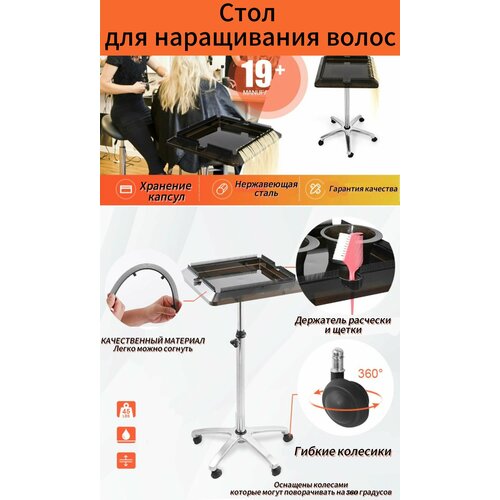 Тележка парикмахерская на колесиках с держателем для наращивания волос. Профессиональная стойка органайзер незаменима для парикмахеров, стилистов и мастеров наращивании волос, Стойка с зубчиками расческами по краям специально создана для удобного горячего наращивания волос и капсулирования. Такое оборудование сильно облегчит работу мастера и поможет все необходимое держать всегда под рукой, не прибегая к дополнительной помощи. Начиная от необходимых профессиональных инструментов и заканчивая прядями для наращивания. Тем самым сократив трудозатраты на проведение данной процедуры. Столик – тележка - это устойчивая конструкция на колесах, которую удобно перемещать по студии в зависимости от ваших потребностей. Держатель для капсуляции выполнен в строгом, стильном дизайне, который впишется в любой интерьер и подчеркнет Ваш профессиональный имидж в глазах клиентов. Стол тумбочка удобен и тем, что имеет регулируемую высоту от 66 см до 100 см, а площадь поверхности составляет 41*41см. Вы с легкостью можете подстроить органайзер под себя и сделать условия работы еще более комфортными. Ведь правильная организация рабочего места играет немаловажную роль в качестве выполненных работ. А эстетику и порядок Вашей рабочей зоны всегда по достоинству оценят ваши клиенты и вернутся к Вам еще не один раз. Мобильная этажерка тумба подставка станет прекрасным подспорьем и дополнительными руками как начинающего мастера, так и профессионала, работающего не один год в бьюти сфере. Регулируемая высота: максимальная высота 100 см. Минимальная высота 66 см. Длина - 41 см. Ширина - 41 см. Держатель для прядей Для капсулирования Волосы для наращивания Для нарощенных волос Подставка Стол на колесиках Пластик
