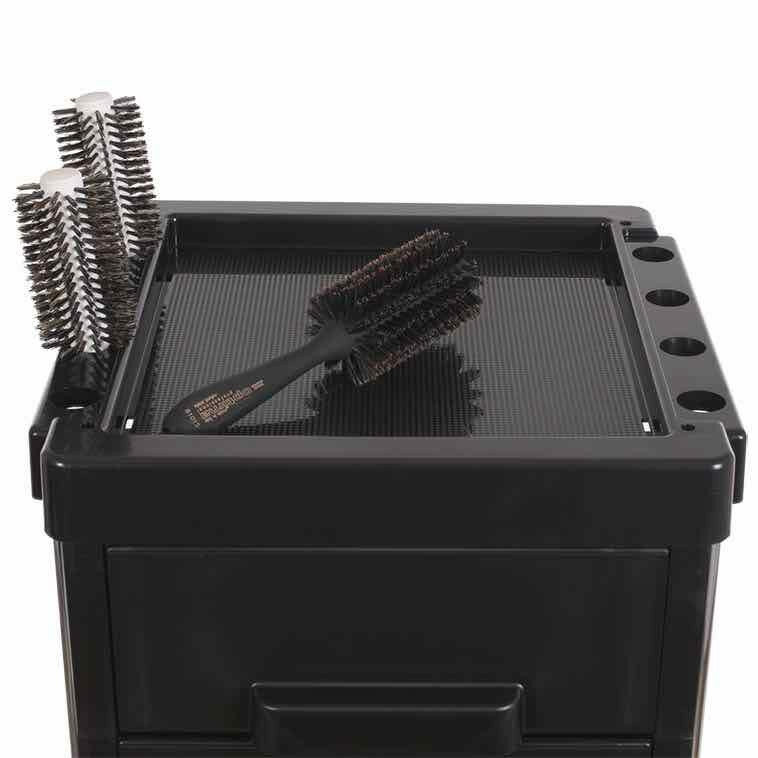 - Встроенные в крышку тележки держатели для расчесок и других парикмахерских инструментов.