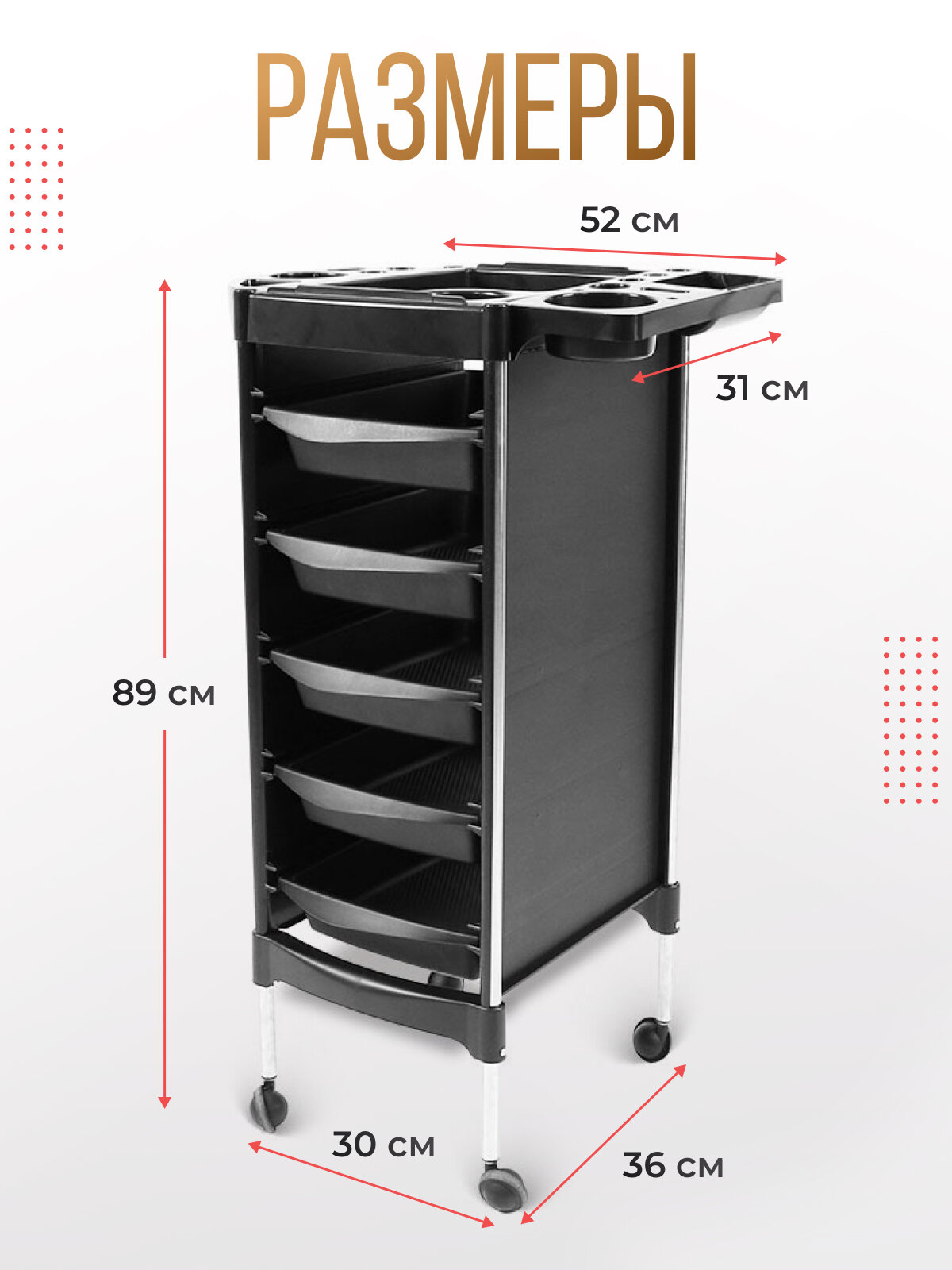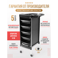 Профессиональная тележка-этажерка для парикмахера является идеальным решением для парикмахеров, колористов, мастеров маникюра, барберов и косметологов. Эта парикмахерская тележка выполнена из красивого черного пластика, имеет стильный принт на двух боковых панелях и прочное металлическое основание, что обеспечивает ей мобильность, функциональность и стильный дизайн. Особенность этой тележки - наличие двух складывающихся полочек, которые идеально подходят для размещения фена и других парикмахерских принадлежностей. Удобный держатель для фена позволяет безопасно хранить его. Отделение для миски с краской обеспечивает легкий доступ к инструментам во время окрашивания волос, а отделение для фольги с рельефным краем для резки - облегчает использование и экономит время. Косметологическая тележка имеет 5 глубоких пластиковых ящика для хранения парикмахерских принадлежностей. Ящики открываются в две стороны, что позволяет легко найти нужное парикмахерское оборудование. Расстояние между ящиками обеспечивает достаточно места для хранения большого количества предметов. Ящики легко открываются и закрываются. Верхняя часть тележки разделена на отсеки для парикмахерского оборудования, таких как ножницы, расчески, и другие парикмахерские принадлежности. Эта тележка парикмахерская на колесах из мягкого силикона, которые вращаются на 360 градусов. Благодаря колесам тележку легко передвигать с места на место без лишних усилий на любом напольном покрытии. Тележка для парикмахера - это незаменимый помощник профессионала и любителя, которые ценят функциональность, элегантный дизайн и надежность. Благодаря своей многофункциональности и удобству использования, тележки парикмахерские позволяют организовать рабочее место таким образом, чтобы все необходимые инструменты всегда были под рукой. Доверьте свои профессиональные нужды этой тележке и она обязательно оправдает ваши ожидания.