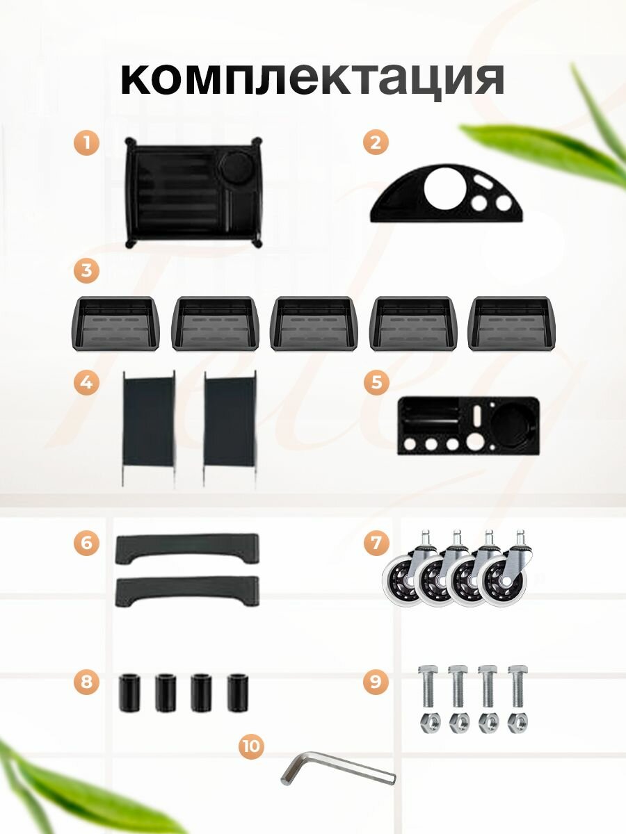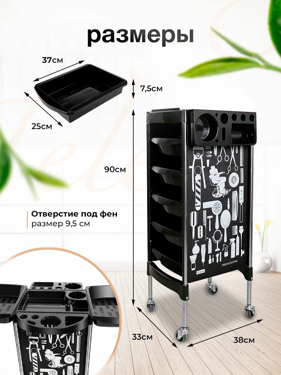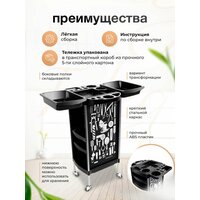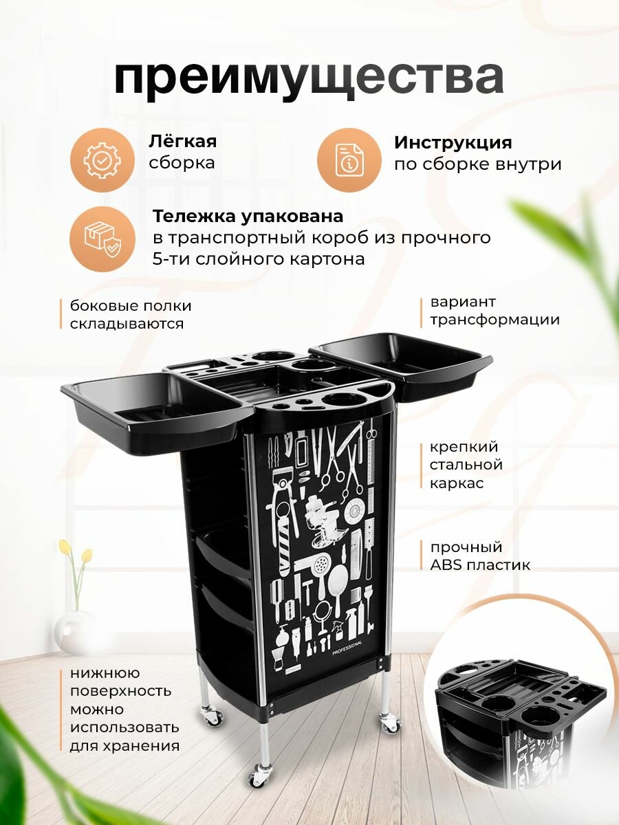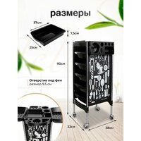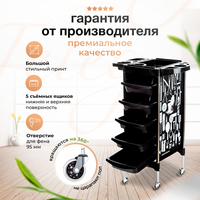 Профессиональная тележка-этажерка для парикмахера является идеальным решением для парикмахеров, колористов, мастеров маникюра, барберов и косметологов. Эта парикмахерская тележка выполнена из красивого черного пластика, имеет большой стильный принт на двух боковых панелях и прочное металлическое основание, что обеспечивает ей мобильность, функциональность и стильный дизайн. Особенность этой тележки - наличие двух складывающихся полочек, которые идеально подходят для размещения фена и других парикмахерских принадлежностей. Удобный держатель для фена позволяет безопасно хранить его. Отделение для миски с краской обеспечивает легкий доступ к инструментам во время окрашивания волос, а отделение для фольги с рельефным краем для резки - облегчает использование и экономит время. Косметологическая тележка имеет 5 глубоких пластиковых ящика для хранения парикмахерских принадлежностей. Ящики открываются в две стороны, что позволяет легко найти нужное парикмахерское оборудование. Расстояние между ящиками обеспечивает достаточно места для хранения большого количества предметов. Ящики легко открываются и закрываются. Верхняя часть тележки разделена на отсеки для парикмахерского оборудования, таких как ножницы, расчески, и другие парикмахерские принадлежности. Эта тележка парикмахерская на колесах из мягкого силикона, которые вращаются на 360 градусов. Благодаря колесам тележку легко передвигать с места на место без лишних усилий на любом напольном покрытии. Тележка для парикмахера - это незаменимый помощник профессионала и любителя, которые ценят функциональность, элегантный дизайн и надежность. Благодаря своей многофункциональности и удобству использования, тележки парикмахерские позволяют организовать рабочее место таким образом, чтобы все необходимые инструменты всегда были под рукой. Доверьте свои профессиональные нужды этой тележке и она обязательно оправдает ваши ожидания.