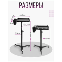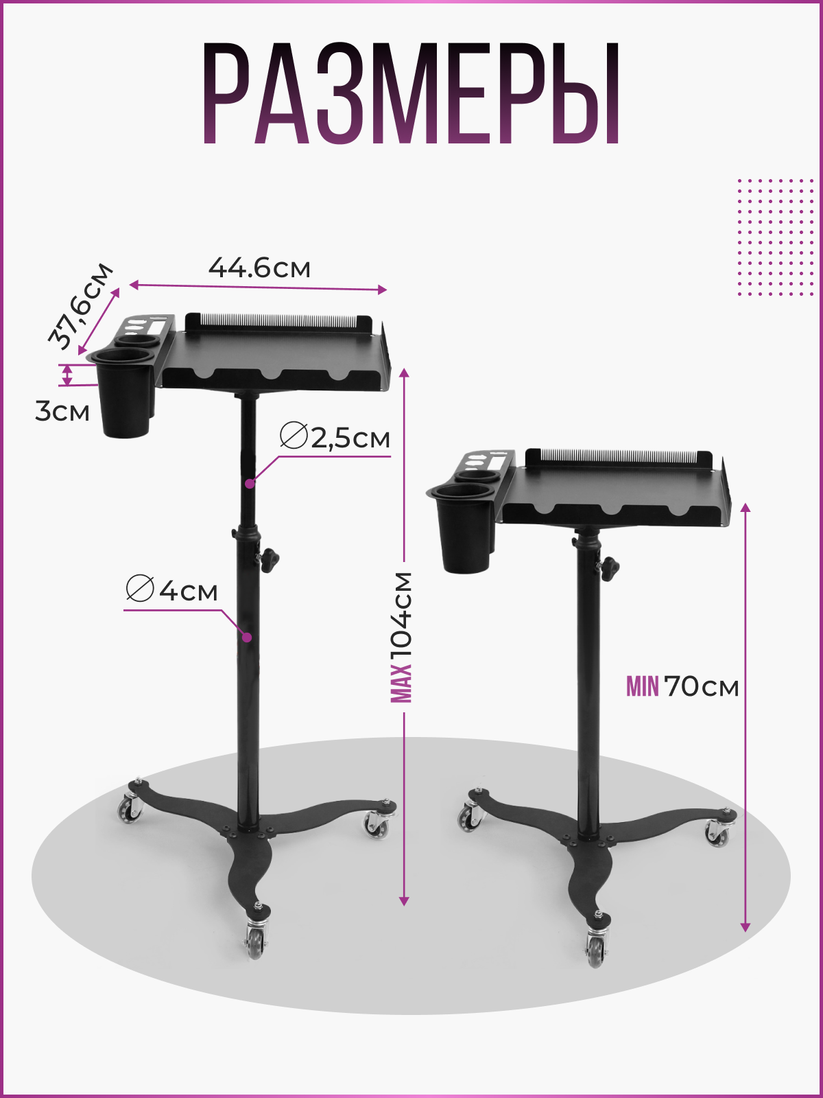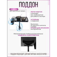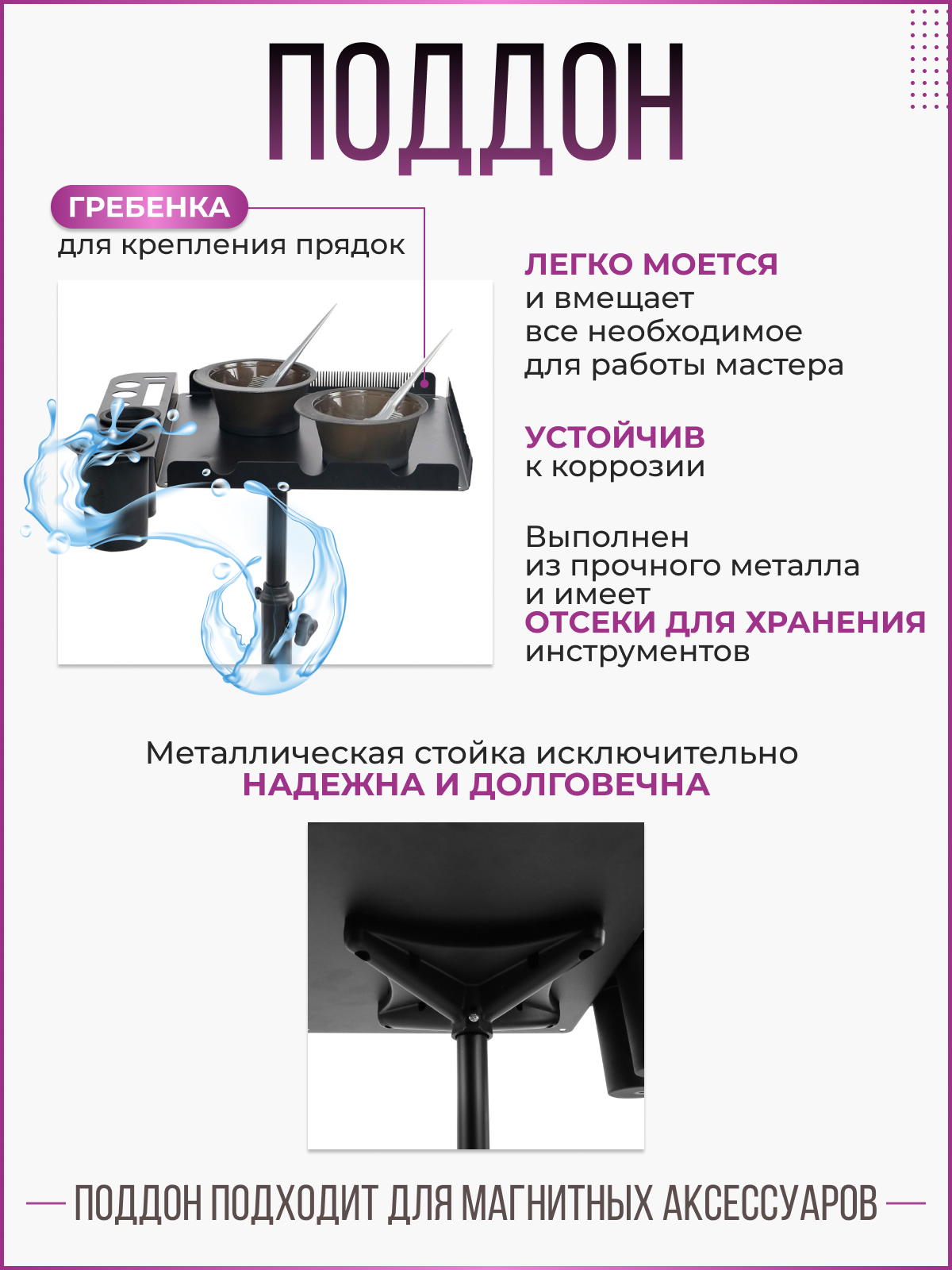 Профессиональная тележка для парикмахера - незаменима в салоне красоты или барбершопе. Это удобное парикмахерское оборудование позволяет эффективно организовать рабочую зону, удобно разместить парикмахерские принадлежности. Стол для окрашивания поставляется с двумя ёмкостями на магнитах, которые прочно закрепляются на металлической рабочей поверхности стола, что очень удобно и выгодно. Чаши легко снимаются и устанавливаются на разные части стола. Стол для парикмахера-колориста имеет раздвижную конструкцию, которая создает комфортные условия для работы. Тележка для наращивания волос оборудована зубчиками с двух сторон, что будет особенно полезно для мастеров по наращиванию волос. Они позволяют легко закреплять волосы и фиксировать их в нужном положении. Тележка парикмахерская для наращивания волос оснащена специальными отделениями для парикмахерских принадлежностей, а также двумя стаканами, в которых мастер может разместить рабочие инструменты. Косметологические тележки на колесиках обладают мобильной конструкцией, что позволяет с легкостью перемещать их по салону и регулировать высоту рабочей поверхности. Одним из важных отличий парикмахерской тележки является металлическая поверхность подставки. Благодаря этому, стол для наращивания волос устойчив к воздействию разогретых приборов, исключена возможность деформации. Стойка для наращивания волос изготовлена из прочных и качественных материалов - металла и пластика. Верхняя часть столика для наращивания волос представляет собой открытую полку размером 37,6*44,6 см, предназначенную для размещения аксессуаров. Тележка парикмахера также оснащена органайзером, который имеет отверстия для размещения рабочих инструментов и стаканы для хранения косметических средств. Это позволяет мастеру удобно расположить все необходимые материалы и инструменты для работы, парикмахерские принадлежности. Для обеспечения легкого перемещения, стол для наращивания волос оснащен колесиками, которые движутся во все стороны.
