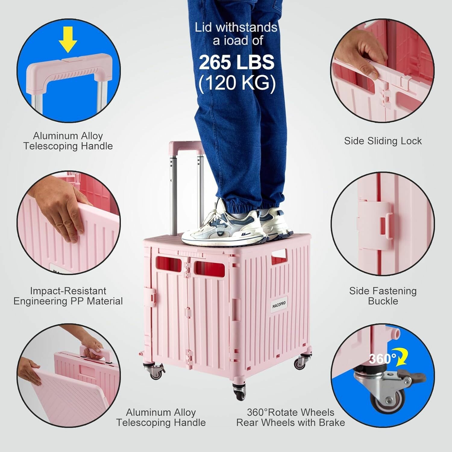 Эта складная тележка изготовлена из высококачественного, прочного, экологически чистого полипропилена. Она оснащена устойчивыми к ржавчине ручками из алюминиевого сплава (прочными и легкими) и износостойкими и устойчивыми к давлению резиновыми колесами, обеспечивающими плавный ход по любой местности и долгий срок службы.