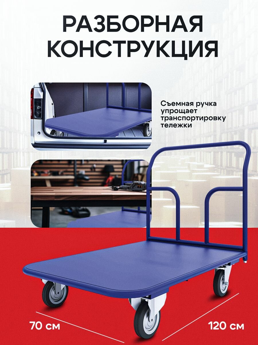 Тележка имеет удобную конструкцию с размерами 120.0 см в длину и 70.0 см в ширину. Это позволяет легко маневрировать и перемещать груз в узких и ограниченных пространствах.