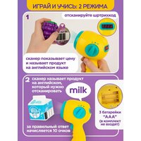 - Сканер со светом и звуком: сканер считывает штрих-коды (14 карточек в комплекте), называет продукты на английском языке и озвучивает цену. Это помогает детям учить английские слова в игровой форме. Работает от 3 батареек типа ААА (в комплект не входят).
