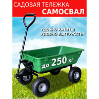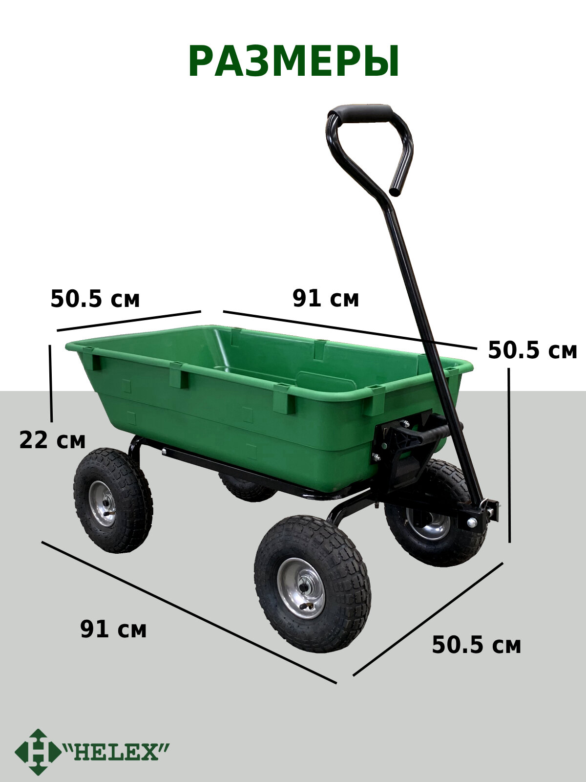 Четырехколесная садовая тележка самосвал Helex G202 станет вашим верным помощником при выполнении различный работ на вашей даче. Благодаря удобной технологии разгрузки вам не придется прилагать дополнительных усилий – тележку можно разгружать движением одной руки. Ручка оснащена функцией антигрязь, поэтому она не упадет на землю если вы ее случайно отпустите, а мягкая накладка добавляет комфорта при транспортировке. Вы можете не бояться перевозки любых, даже самых тяжелых грузов, ведь у нашей тележки усиленный металлический каркас и прочный пластиковый кузов. В отличии от обычных садовых тележек, тележка-самосвал Helex G202 легко перемещается на 4-х широких надувных колесах, чем идеально подходит для женщин. Также, конструкцию отличает очень высокая маневренность, ее можно разворачивать почти на месте не прилагая дополнительных усилий. Такая 4-х колесная садовая тележка станет прекрасным подарком для любого владельца дачного участка, ведь она облегчит ему работы в саду и на огороде. ∙ Размер в собранном виде (ДхШхВ): 91х50,5х50,5 см ∙ Размер кузова: 91x50,5x22см ∙ Материал: стальной каркас с порошковым покрытием, пластиковый кузов (полипропилен), надувные резиновые колеса ∙ Цвет: зеленый ∙ Вместимость: вода 80 л ∙ Максимальная нагрузка на кузов: 250 кг ∙ Материал ручки: Железо + вспененный ЭВА ∙ Колеса: надувные резиновые, d 26x8,5 см ∙ Функция «антигрязь» ∙ Тип механизма разгрузки: самосвал (ручной, разгрузка одной рукой) ∙ Вес нетто: 13 кг