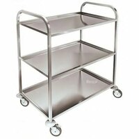 850х450х900мм, 12,3кг, сталь 201, каркас разборный из трубы 25,4х25,4мм, 3 полки, расстояние между полками 24см, 4 колёса (2 колеса со стопором), макс. суммарная загрузка 45кг