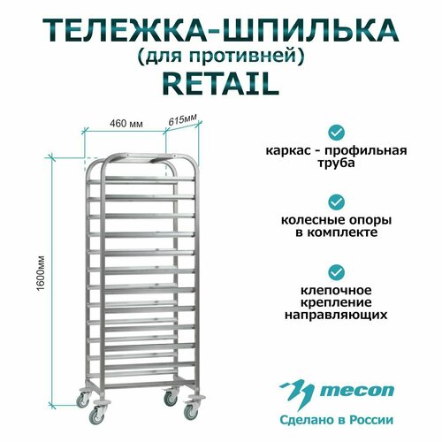 Тележки-шпильки используются на предприятиях общественного питания и предназначены для кратковременного хранения продуктов, транспортировки гастроемкостей/противней/подносов/лотков с полуфабрикатами или готовой продукцией внутри производственных помещений. Тележки-шпильки состоят из разборного каркаса и поворотных колесных опор.