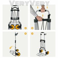 Складная тележка на колёсах – это незаменимый аксессуар для вашего дома. Она изготовлена из алюминия и способна выдержать нагрузку до 150 килограммов. Двойные колёса придают дополнительную прочность и устойчивость, а прорезиненная поверхность обеспечивает мягкий и бесшумный ход тележки. Благодаря своему размеру (110 x 52 x 49,8 сантиметров) и весу (6 килограмм), тележка легко транспортируется и может быть использована в любом месте.