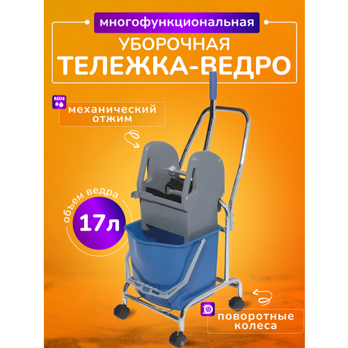Тележка уборочная 17л, одноведерная с отжимом, каркас из нержавейки. Тележка уборочная с одним ведром предназначена для влажной уборки помещений и мойки полов. Рекомендуется применять для бытовых и производственных помещений с небольшой площадью. Тележка имеет прочную раму из нержавеющей стали, оснащённую четырьмя поворотными колёсами, обеспечивающих необходимую устойчивость и маневренность при передвижении. В комплект входит пластиковое ведро с носиком и механический отжим для плоских и верёвочных мопов. Тележка имеет компактный размер, не занимает много место при хранении, удобна и практична при эксплуатации.