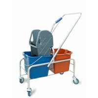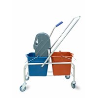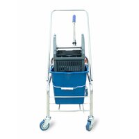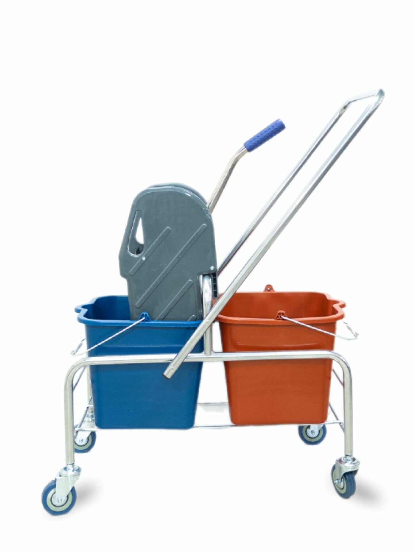 Тележка уборочная двухведёрная, предназначена для уборки и мойки полов, перемещения моющих растворов и клининговых принадлежностей. Рама металлическая, крашенная, серого цвета. В ведрах есть мерная шкала для удобства.