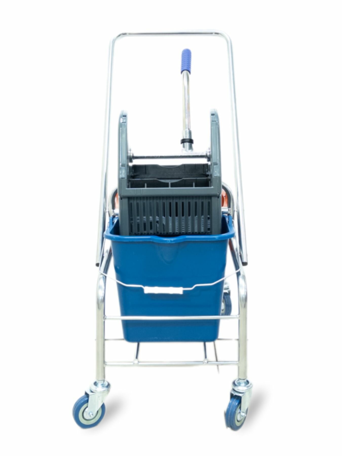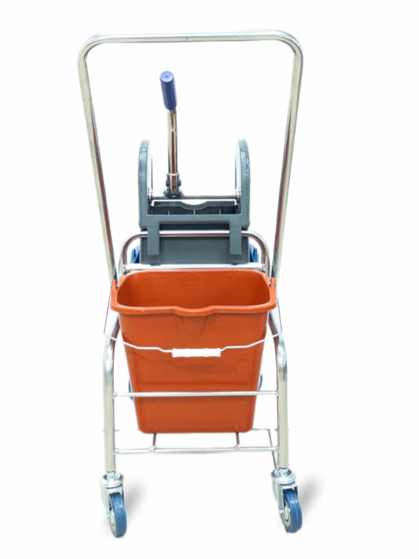 Ручка для управления жёстко не закреплена и может перекидываться и фиксироваться с обеих сторон уборочной тележки. Тележка уборочная используется для профессиональной и домашней уборки, является основным уборочным инвентарем в клининговых компаниях. Уборочное ведро на колесах для уборки помещений - незаменимый помощник в поддержании чистоты и порядка в офисах, ресторанах и других коммерческих или общественных помещениях.
