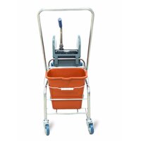 Тележка с отжимом оснащена удобными съемными ведрами вместимостью 16 литров, которые имеют ручку и носик для удобного слива воды. Так же есть отжим, который подходит для швабр с плоскими и веревочными мопами. Поворотные колесики обеспечивают плавное и бесшумное передвижение по поверхности.