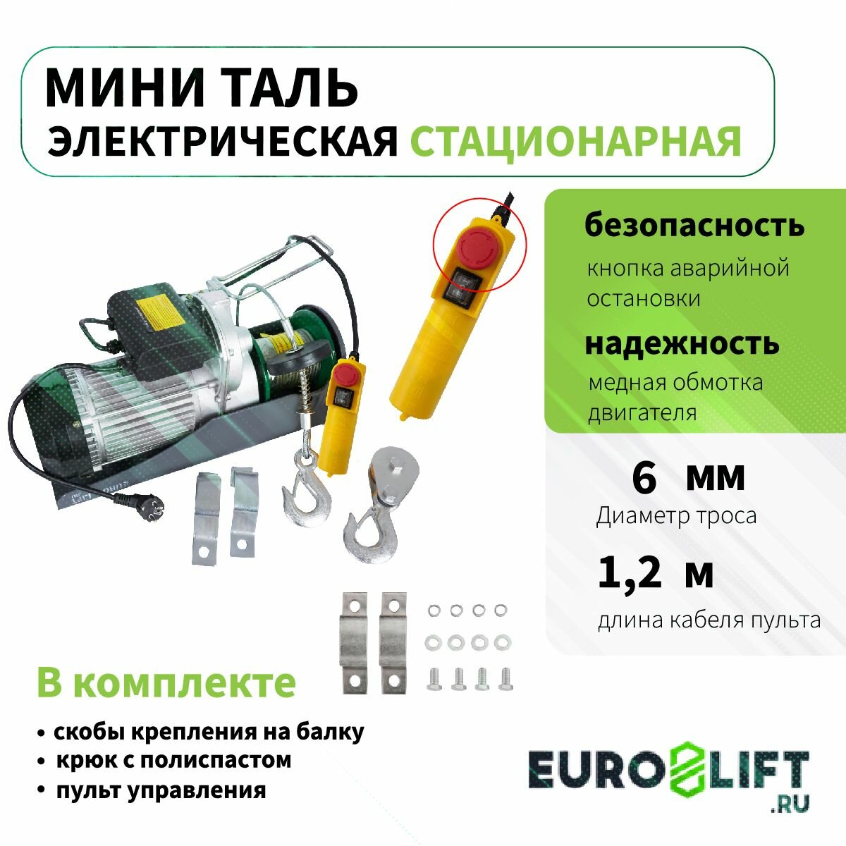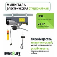 Мини-таль электрическая (лебедка электрическая) - компактное и легкое устройство для подъема грузов весом до 1 т со скоростью 10 м/мин на высоту 12 метров. Устройство работает от электросети 220В в непрерывном режиме и может полезно в небольших помещениях, где трудно использовать большие подъемные механизмы. Тельфер электрический 1000 кг имеет небольшой вес и размер, что позволяет легко переносить его с места на место. Лебедка обладает повышенной износостойкостью и прочностью крепления. Электромагнитный тормоз обеспечивает безопасность работы с талью и предотвращает случайное опускание грузов. Двигатель лебедки имеет тип электрозащиты IP54, что позволяет использовать устройство даже в сырых помещениях. Для удобства управления имеется пульт на длинном проводе в 1,2 м. Электролебедка применяется на строительной площадке, для гаража, подвала, мастерской, в складских помещениях и при переносе оборудования. Лебедки электрические серии РА с высокой скоростью подъема и опускания груза, что делает устройства очень эффективными в работе.
