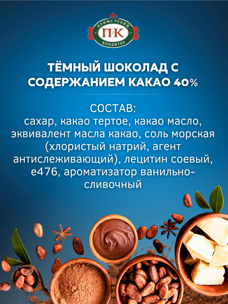 | Состав | сахар, какао тертое, какао масло, эквивалент масла какао, соль морская (хлористый натрий, агент антислеживающий), лецитин соевый, е476, ароматизатор ванильно-сливочный |
