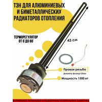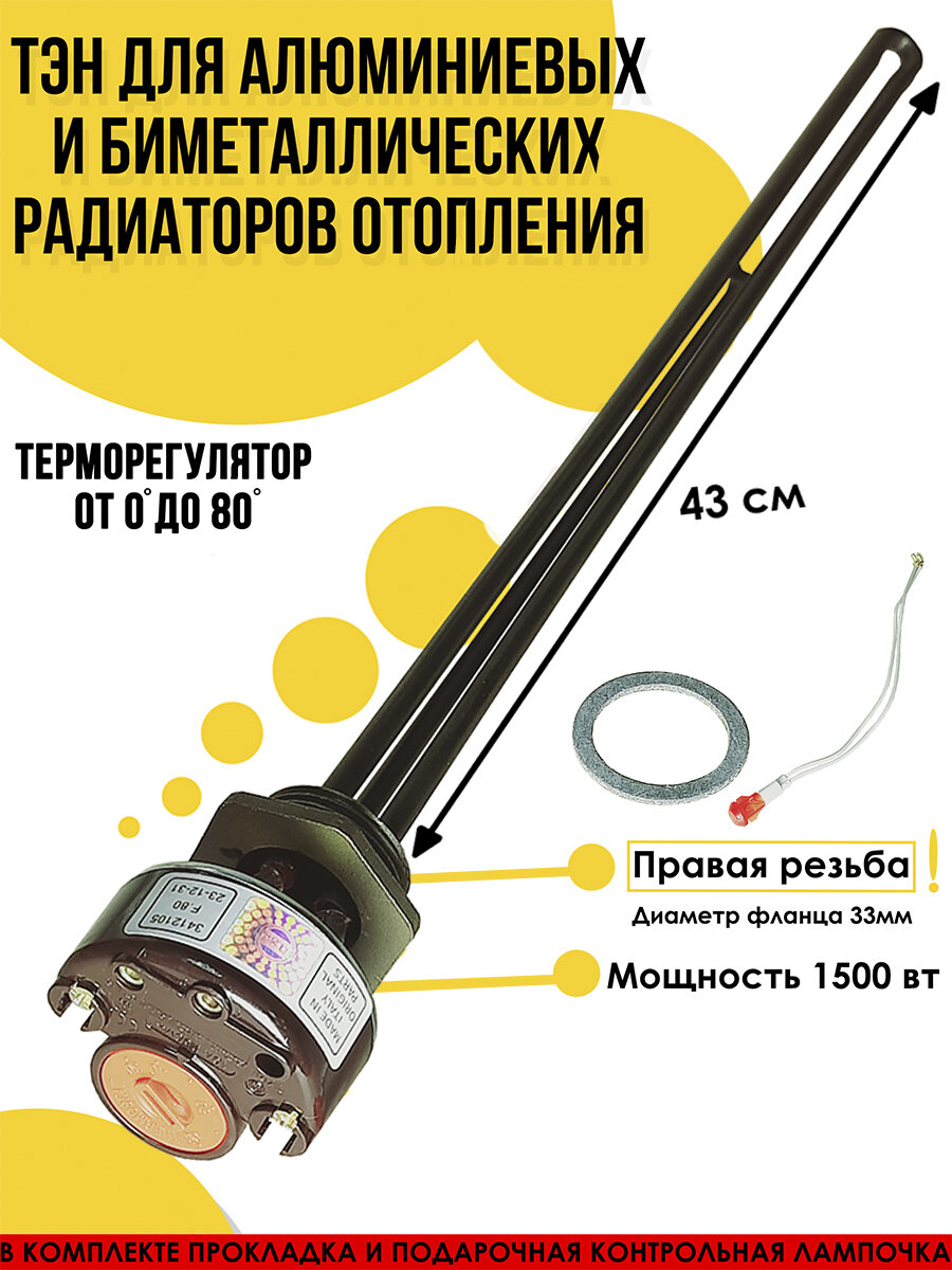ТЭН для алюминиевых и биметаллических радиаторов 1,5 кВт. 220В. правая резьба, нержавеющая сталь, фланец из латуни, в комплекте с терморегулятором от 0 до 80 градусов + прокладка. Терморегулятор может поставляться 2 типов: