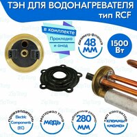 Ремкомплект с ТЭНом типа RCF для водонагревателей Ariston, Ballu, De Luxe, Polaris, Thermex и др.- ТЭН, изготовленный из меди мощностью 1,5 кВт, магниевый анод с резьбой М6, прокладка с 5 отверстиями 125/75 мм, крепежный болт. Прижимной фланец с диаметром 48мм, в него впаян сам ТЭН и трубка под терморегулятор, внешний диаметр трубки ТЭНа 8,5мм, внутренний диаметр трубки под терморегулятор 6,5мм. Артикул - 184280. ТЭН типа RCF крепится в бак посредством круглого пятиболтового фланца D-75. Конструкция ТЭНов разработана специально для возможности быстрой сборки со стержневым термостатом. Производитель - EC (Elecrtic Components).
