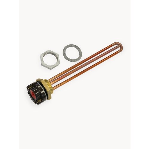 ТЭН для нагрева воды со встроенным терморегулятором. Резьбовое соединение G 1 ¼” тип RDT "Ariston" Мощность 2000Вт 220В. В ТЭН встроен стержневой терморегулятор (термостат) - Диапазон регулировки температуры 40-80 °С, 15А. Погружная резьба ТЭН с учетом резьбы – 280 мм. Материал ТЭНа–Медь, фланец-Латунь. Гайка под ключ 55 мм. Производитель – Китай. Подходит для работы в бочках летнего душа, бытового рукомойника ЭВБО, Еврокубах и прочих емкостях открытого типа. Для эксплуатации в накопительных водонагревателях (бойлерах) закрытого типа рекомендуем использовать комплект ТЭНов c терморегулятором RDT и RCT производства Италия 182244К, которые также представленных в нашем магазине. В комплект входят: тэн, терморегулятор, оцинкованная гайка и паронитовая прокладка.