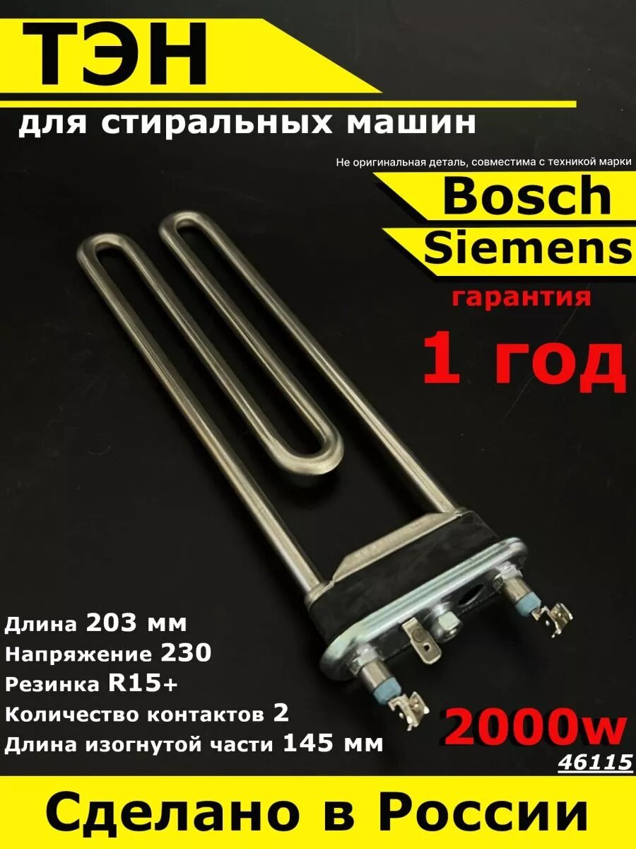 ТЭН для стиральных машин. Устанавливается на стиральные машины индезит, аристон и множество других марок так как имеет стандартные размеры, которые совместимы почти со всеми марками стиральных машин. Имеется отверстие под датчик температуры воды. Размеры на фото! Датчик извлекается из старого ТЭНа и вставляется в новый Длина 200 мм, 46054, Для стиральных машин, Ariston, Gorenje, Indesit Мощность 1700 Вт. Производитель ИТА, Напряжение 230. Загрузкой 3,5, 4, 5, 6, 7, 8 кг4,5, 33, 40, 45, 48, 50, 55, 60 см. Наличие отверстия. Прямой Длина изогнутой части 150 мм Ширина резинки R15+ Количество контактов 2. Длина нагревательного элемента L=203 мм. Длина выгнутой части M=145 мм. Ширина резинки R=15 мм. HTR019AR, 094715, 081780, 110148, C00094715. Чтобы правильно подобрать ТЭН, нагреватель, нагрев. Классу А+ соответствует расход менее 0,17 кВт·ч/кг, А++ — менее 0,15 кВт·ч/кг, и А+++ — менее 0,13 кВт·ч/кг. Обороты отжима 400 600 800 1000 1200 1400. Для вашей стиральной машины, надо обратить внимание на Длину ТЭНа. Бесконечно долго стирает, холодная вода. Ошибка F08 F8 на индезит аристон. Она замеряется от фланца (основание резинки) до конца греющей трубки. Допускается устанавливать ТЭН короче на 1-2см. Мощность Вы можете установить ТЭН в стиральную машину с мощностью +/- 100 Ватт. Отверстие во фланце (есть / нет). Форму (прямой / изогнутый). ТЭН электрический , тен нагревательный, на стиральную машину, термо регулятор, нагревательный элемент для стиральной машины, нержавейка, BOSCH бош INDESIT ARISTON candy канди siemens сименс Whirlpool вирпул Haier хаир ATLANT атлант