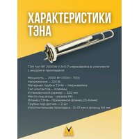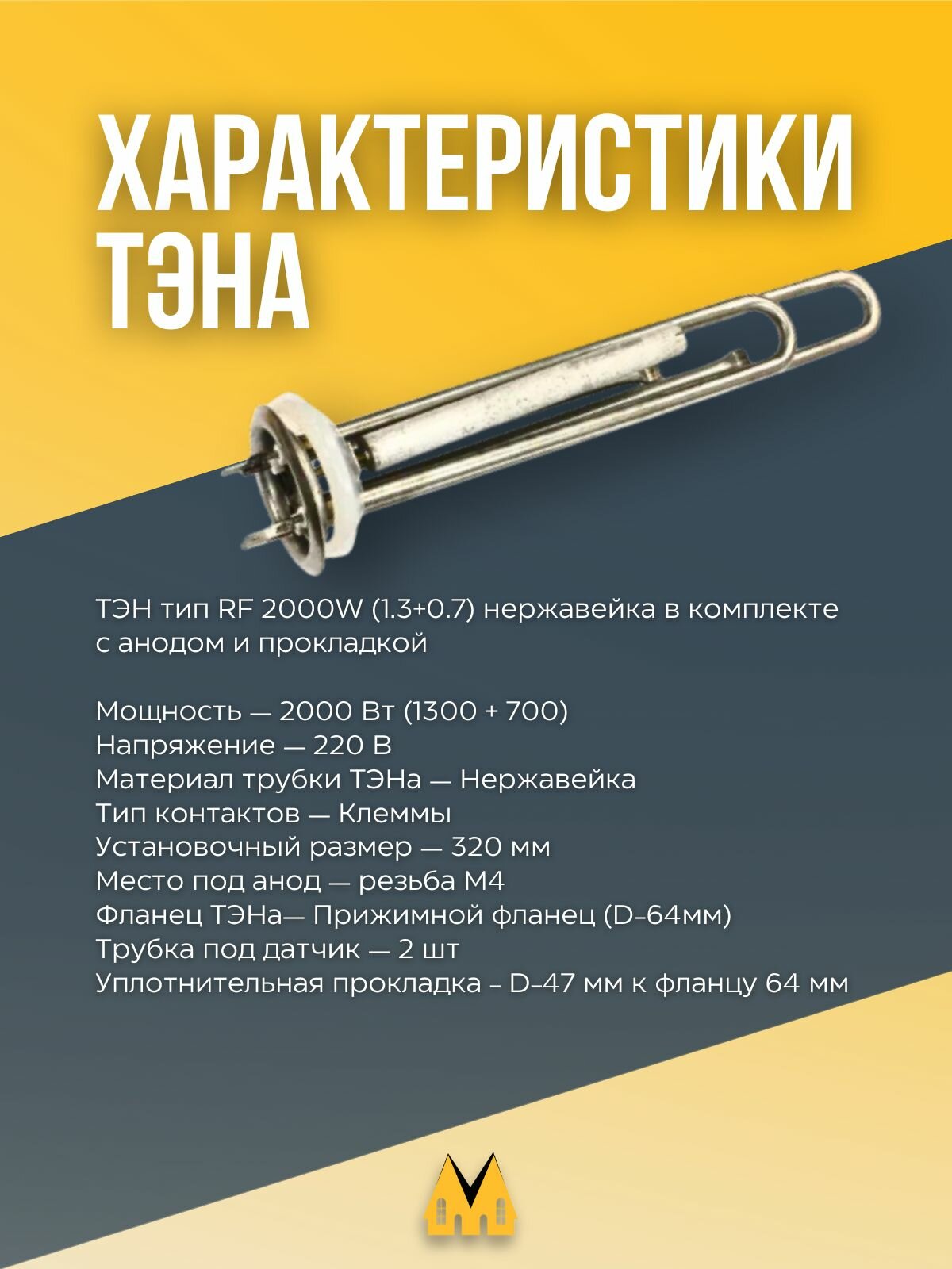 ТЭН тип RF 2000W (1300+700) нержавейка с анодом и прокладкой для водонагревателя Thermex, Electrolux, Zanussi. ТЭН тип RF мощностью 2000W (1300+700) на фланце диаметром 64 мм - идеальное решение для вашего водонагревателя. ТЭН изготовлен из нержавейки, что обеспечивает высокую эффективность и долговечность. Подходит для использования с такими брендами, как Thermex, Electrolux, Zanussi, Ballu и Polaris.