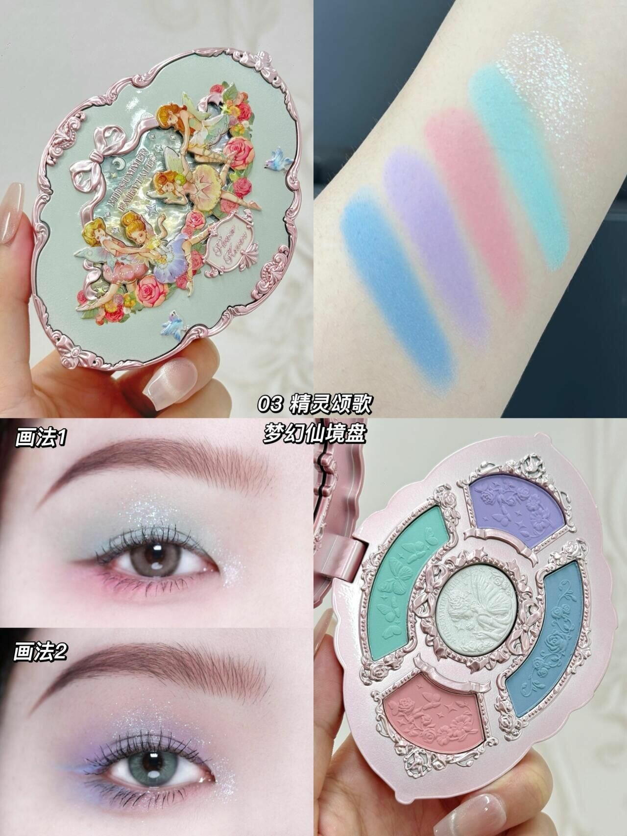 Наша палитра теней для век, созданная по мотивам старинных шкатулок для драгоценностей, украшена нежным розовым гальваническим покрытием, которое придает ей элегантности. Упаковка сочетает в себе очарование сказки и классическую красоту, на ней изображены цветочные феи на фоне цветущей природы. Это сочетание юношеских фантазий и неподвластной времени изысканности придаст вашей коллекции макияжа сказочный оттенок. Созданная по последнему слову техники, наша палитра включает в себя четыре матовых оттенка и один перламутровый оттенок. Шелковистая текстура, она легко наносится на кожу, идеально прилипает к ней, обеспечивая долговечное ношение, водонепроницаемость и яркие цвета.