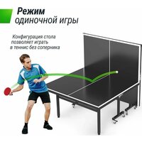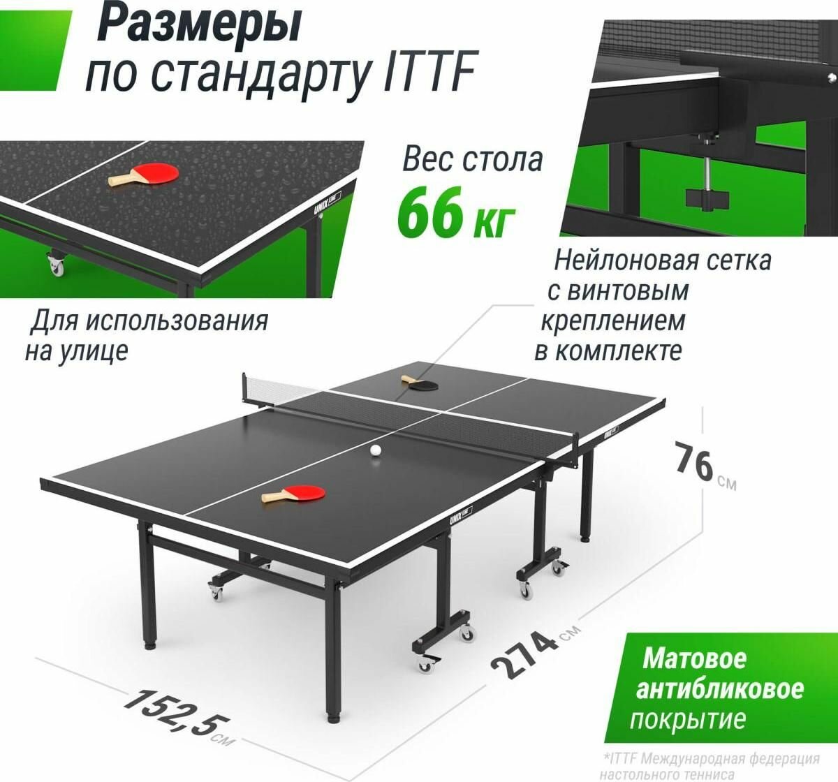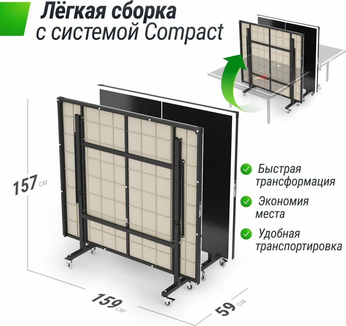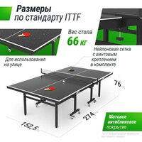 | Особенности | встроенная сетка, держатель для мячей, держатель для ракеток, одностороннее складывание, полное складывание, регулировка высоты, сертификат ITTF, съемная сетка, транспортировочные колесики, фиксаторы на колесиках |