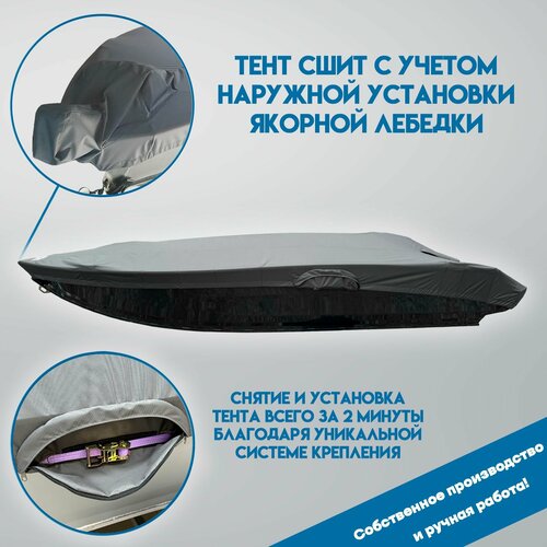 обратите внимание! Сверьте фото из карточки товара с комплектацией вашей лодки! Наличие или отсутствие кринолинов, ручек (рейлингов), отсутствие роульса или установлена лебедка наружного или скрытого типа. Ищите в нашем каталоге подходящий вам вариант тента! НЕ заказывайте тент, если у вас другая модель лодки! В таком случае тент вам не подойдет и не сядет на лодку должным образом. Все лодки имеют разные габариты и разную геометрию. Наши тенты не являются универсальными - мы изготавливаем тенты только строго по лекалу конкретной модели лодки.