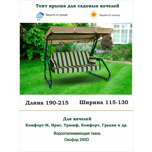 Тент крыша для садовых качелей размер: длина 190-215 см, ширина 115-130 см. Такой тент подойдет для следующих моделей садовых качелей: комфорт-м, ирис, триумф, комфорт, грация. Тент изготовлен из специальной водоотталкивающей ткани Oxford 240D. Такая ткань используется в производстве палаток, рюкзаков, курточек и другой продукции. Для надежного крепления крыши к качелям изготовлены продольные и поперечные кулисок. За счет них Вы легко сможете закрепить тент. На данный период времени рынок предлагает большой ассортимент садовых качелей. Поэтому, что бы правильно выбрать нужный тент - сделайте замер. Замер нужно сделать по металлическому каркасу или Вы можете измерить старый тент