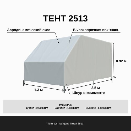 Тент на прицеп 2513 с аэродинамическим скосом: - Прочный и устойчивый к атмосферным воздействиям: этот тент изготовлен из высококачественной пвх ткани, обеспечивающий долговечность и защиту от различных погодных условий, таких как дождь, снег и ультрафиолетовые лучи. - Надежное и плотное прилегание: этот тент обеспечивает надежную и плотную посадку. - Защита от пыли и мусора: с помощью этого тента ваш автомобильный прицеп будет чистым от пыли, грязи и мусора. - Простая установка и хранение: тент легко устанавливается и снимается, что делает его удобным в использовании. Когда он не используется, его можно компактно сложить или свернуть для экономии места при хранении. - Универсальная совместимость: этот тент предназначен для моделей ТИТАН и АТЛАНТ с размерами кузова 2.5 на 1.3 метра и с высотой борта 30 и 50 см. - Гарантия качества: будьте уверены в качестве тента, поскольку он проходит испытания на соответствие стандартам, обеспечивая надежность и долговечность. - Размер тента ( 2500 х 1300х920 мм). - Шнур для крепления тента идет в комплекте.