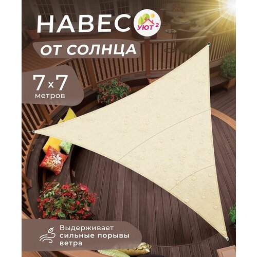 Паруса 7*7*7 м состоят из пяти полос ткани. Для пошива белых, бежевых, серых и оливковых тентов используется плотный синтетический материал с водоотталкивающим покрытием из полиуретана - оксфорд 600 D PU.