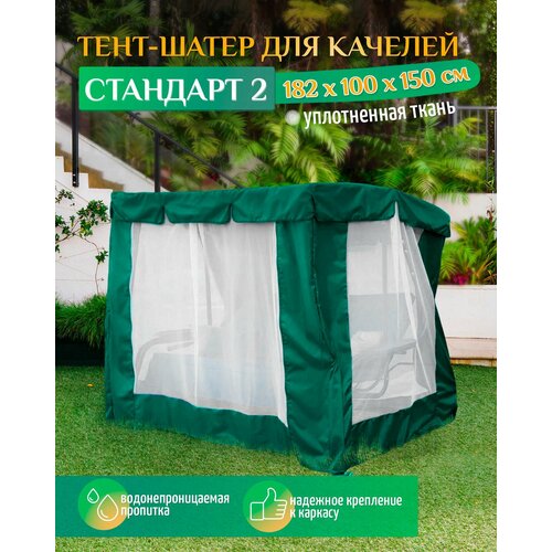 Размер тента шатра для качелей Стандарт 2 182 х 100 х 150 см. Для создания уютной атмосферы имеются боковые вставки. На передней стенке имеются два замка-молнии, это защитит Вас как чехол от мошкары в жаркое время года, и укроет от дождя, пыли и частиц земли в пасмурную погоду. Их можно отстегнуть, подняв вверх сетку и закрепив ее у основания крыши. Надевается на каркас крыши Ваших качелей: по углам имеются кармашки, в которые вставляются углы каркаса крыши и завязки для дополнительной фиксации. Есть каналы, через которые проходят дуги каркаса крыши. Прилегает плотно, не провисает и не создает «парус».