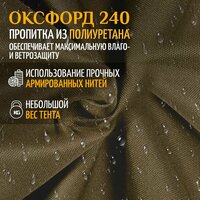 Туристический тент – идеальный выбор для активного отдыха на природе. Этот навес туристический изготовлен из прочной ткани Оксфорд 240 с водоотталкивающей пропиткой, обеспечивающей надежную защиту от ветра, дождя и солнца. Туристический тент гарантирует комфортное пребывание в любых погодных условиях, а просторная двускатная форма предоставляет большую площадь покрытия.