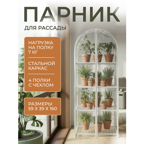 Лёгкий и компактный стеллаж-парник для рассады и цветов решит проблему с размещением лотков и горшков с растениями, подходит для использования на балконе, подоконнике. Возможно использовать как напольный стеллаж. Домашний парник для рассады также предназначен для выращивания растений при подготовке к пересадке в открытый грунт. Прямоугольная вертикальная модель минипарника обеспечивает комфортный доступ к растениям для полива и ухода. А большое и широкое окно, оснащенное застежкой-молнией, позволяет с комфортом ухаживать за растениями, находящимися внутри. Окно можно открыть на время для проветривания растений в жаркую и душную погоду. Решетчатые полки обеспечивают свободную циркуляцию воздуха. Чехол из ПВХ-пленки с застежкой помогает поддерживать необходимый микроклимат. Конструкция лёгкая, весит 2,5 кг, что позволяет без труда перемещать с места на место. Время сборки занимает 8 минут, в отличии от аналогов не требует применения инструментов. Отлично подойдет для микрозелени, овощей, цветов, черенкования. Расстояние между полками 34 см в высоту. Комнатный напольный парник металлический можно использовать для высокой рассады, сняв верхнюю полку.