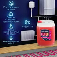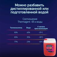 «THERMAGENT -65» — теплоноситель на основе высококачественного очищенного этиленгликоля. Предназначен для использования в качестве рабочей жидкости в закрытых системах отопления, вентиляции и кондиционирования для жилых и производственных зданий, систем охлаждения производственного оборудования, чиллеров, холодильных агрегатов и т. д. Подходит для работы в тяжелых климатических условиях, температура начала кристаллизации составляет -65 °С. В состав добавлены присадки, придающие теплоносителю антикоррозионные, антивспенивающие и антибактериальные свойства. Теплоноситель имеет увеличенный срок службы* (до 10 отопительных сезонов).«THERMAGENT -65» может работать с любыми типами отопительных котлов: газовыми, дизельными, электрическими, однако не подходит для электролизных котлов (типа «Галан»), в которых нагрев происходит за счет пропускания электрического тока через теплоноситель. «THERMAGENT -65» является концентратом, поэтому допускается разбавление теплоносителя дистиллированной или подготовленной водой. Для разбавления желательно использовать воду с жесткостью до 6 единиц. Использование воды с повышенным содержанием солей может также привести к выпадению осадка. Пропорции для разбавления: в соотношении 60% теплоносителя и 40% воды, получается теплохладоноситель с температурой начала кристаллизации -25 °С и загустевающий при -30 °С; в соотношении 65% теплоносителя и 35% воды, получается теплохладоноситель с температурой начала кристаллизации -30 °С и не загустевающий при дальнейшем понижении температуры вплоть до -37 °С; в соотношении 77% теплоносителя и 23% воды, получается теплохладоноситель с температурой начала кристаллизации -40 °С и не загустевающий при дальнейшем понижении температуры вплоть до -47 °С. Разбавление теплоносителя более чем на 50%, кроме повышения температуры замерзания приведет к ухудшению его антикоррозионных свойств, а также к возможному выпадению осадка солей жесткости, растворенных в воде. Внимание! В системе отопления нельзя использовать элементы, содержащие цинк, в частности, оцинкованные трубы. Теплохладоноситель предназначен исключительно для технического использования, поэтому не допускается его попадания в пищевые продукты и в питьевую воду во избежание отравления! При случайном попадании жидкости на руки или на одежду он легко смывается водой, не оставляя раздражения или ожогов. *10 отопительных сезонов – срок эксплуатации, определенный по результатам испытаний во внии Коррозии. Срок службы теплохладоносителя также зависит от режима его эксплуатации. Не рекомендуется доводить теплохладоноситель до состояния кипения (температура кипения при атмосферном давлении составляет +106 — +116 °С, в зависимости от степени его разбавления водой).