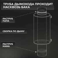 Печь, оснащенная теплообменником, позволяет разместить выносной бак с горячей водой в помещениях, смежных с парилкой. Для этой цели на дымоход печи устанавливается универсальный теплообменник из нержавеющей стали с двумя штуцерами 3/4 дюйма, который с помощью труб соединяется с выносными баком.
