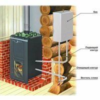 Устанавливается внутри топки банной печи на одну из стенок: слева или справа, как вам удобно. Затем системой труб к нему подключается бак для воды. Теплообменник нагревается и за счет естественной циркуляции происходит нагрев воды в навесном баке.
