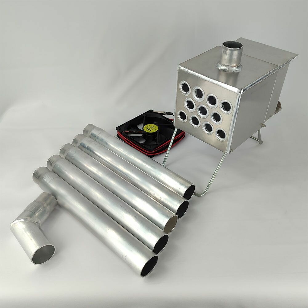 Теплообменник изготовлен из алюминия толщиной 3 мм. Детали и соединения проварены аргонно-дуговой сваркой, что исключает утечку угарного газа образующегося при горении. Оригинальная форма и конструкция теплообменника, позволяют получить увеличенную площадь теплообмена, что обеспечивает высокие показатели КПД, при небольших габаритных размерах.