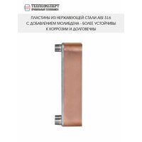 Паяный пластинчатый теплообменник Тэплоэксперт предназначен для нагрева воды в системе горячего водоснабжения (ГВС). Подача греющего теплоносителя осуществляется от вашего котла или от сетевого контура котельной с температурой 70 градусов. Нагреваемый контур - вода из водопровода или скважины на входе с температурой 5 градусов С поступает в теплообменник и на выходе из системы ГВС – вода с температурой 60 градусов C выходит из-под крана. Теплообменник может работать и на других температурных графиках, при этом, дельта температур между греющим теплоносителем и нагреваемым контуром на выходе в системе ГВС должна быть не менее 10 градусов C. (то есть, если греющий теплоноситель 60 градусов C, то вода из под крана будет 50 градусов С и т.д.)Характеристики представленного теплообменника:1. Мощность - 28 кВт.2. Расход ГВС - до 0,44 т/ч (что соответствует 7,3 л/мин.)3. Греющий Теплоноситель (от котла или сетевой контур) - Вода. Вход: 70 градусов С, Выход: 40 градусов С.4. Нагреваемый контур ГВС – холодная вода с температурой 5 С поступает в теплообменник и с температурой 60 градусов С выходит из теплообменника и поступает в краны.5. Патрубки: Ду20 (3/4"), наружная резьба.6. Пластины теплообменника изготовлены из нержавеющей стали - AISI316 с добавлением молибдена, устойчивы к коррозии, хлоридам и воздействию высоких температурРабочие характеристики: