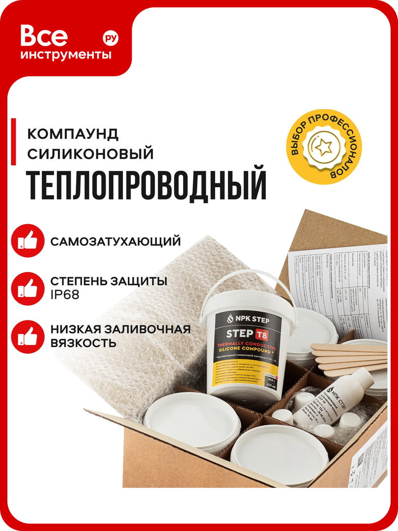 STEP-T8 - это двухкомпонентный заливочный силиконовый компаунд с повышенной теплопроводностью, который отверждается при комнатной температуре. Этот теплопроводящий кремнийорганический состав применяется для заливки изделий радиоэлектроники, обеспечивая защиту компонентов от внешних факторов, таких как удары, вибрации, влага, загрязнения и химически активные вещества, а также улучшая тепловой режим работы устройств. Компаунд вибростойкий, влагостойкий, морозостойкий, застывает при комнатной температуре (компаунд холодного отверждения), подходит для герметизации электроники, разъёмов и является самозатухающим и огнестойким!
