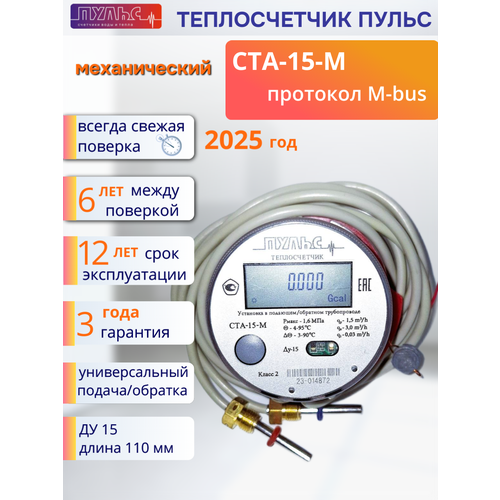 Механический (тахометрический) квартирный теплосчетчик пульс СТА 15-М (протокол M-bus) предназначен для измерения потреблённой тепловой энергии ( в Гкал) в домах с горизонтальной разводкой систем отопления . Для считывания данных и интеграции в автоматизированные системы контроля и учета энергоресурсов (аскуэ), теплосчетчик использует протокол M-bus. Данная модель является универсальной, подходит для монтажа на подающий и обратный трубопровод, в зависимости от установки термопар. Межповерочный интервал 6 лет! Срок службы 12 лет. Счетная голова прибора не съемная , поворотная. Модель СТА-15 очень компактная, это имеет большое значение в том случае, если в коллекторе место ограничено. важно! Все теплосчетчики пульс СТА 15 имеют выход под диспетчеризацию (импульсный или RS-485 или M-bus) . Этот выход имеет значение только в том случае, если у вас в доме организован автоматический сбор данных. Если вы снимаете показания визуально, то на этот выход можно не обращать внимание и покупать любой! Если у вас установлен теплосчетчик другого производителя и подошел срок замены, можете смело приобретать теплосчетчик пульс СТА 15, обратив внимание на диаметр условного прохода ДУ 15 и выход под диспетчеризацию (если она у вас имеется). Монтажная длина у всех квартирных теплосчетчиков стандартная, 110 мм. Данная модель является классикой и отлично зарекомендовала себя среди потребителей.