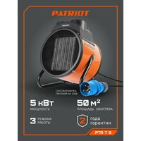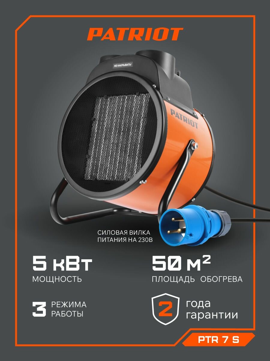 Электрический тепловентилятор Patriot PTR 7S, 5.0 кВт, 220В, терморегулятор, 633307300 - компактный, мобильный, надежный нагревательный электроприбор. Служит для обогрева воздуха в различных помещениях. В жаркое время года возможно использование прибора в качестве вентилятора, без включения нагревательных элементов. В обогревателе используется высококачественный керамический полупроводниковый нагревательный элемент PTC, при работе которого уровень мощности автоматически корректируется в зависимости от изменений температуры окружающей среды. За счет уникальных свойств нагревательного элемента, увеличивается срок службы прибора. В обогревателе установлено мощное воздуходувное устройство, благодаря которому приятный горячий воздух подается с большой скоростью, что позволяет быстро и эффективно прогреть помещение.