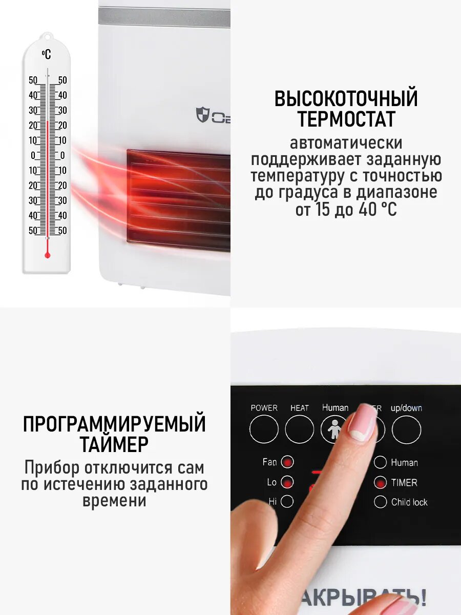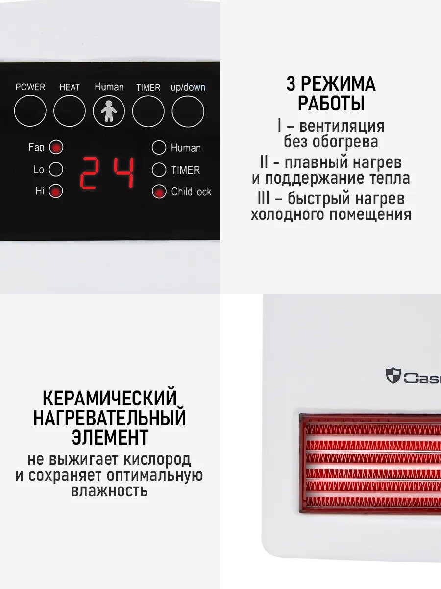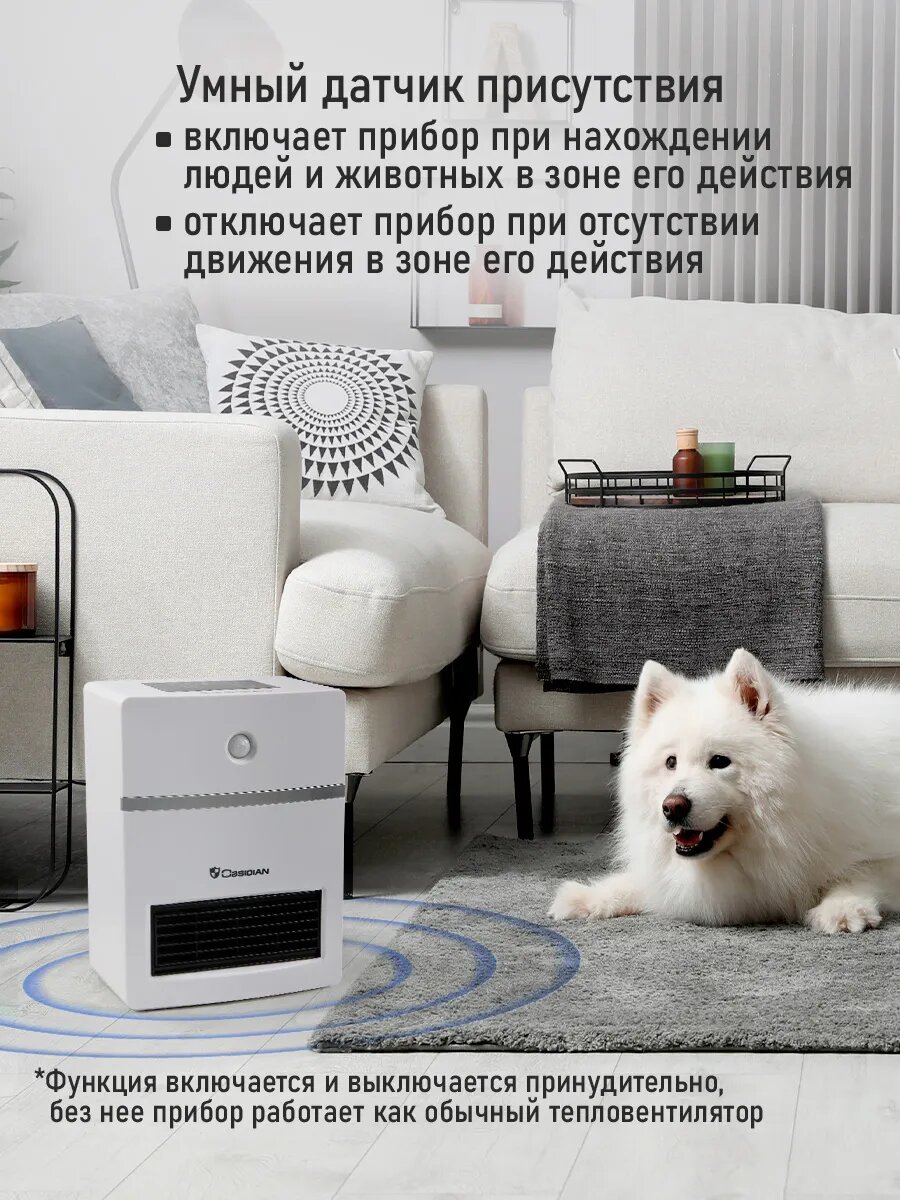 Тепловентилятор электрический керамический мощностью 2000 Вт, Датчик присутствия, Керамический нагревательный элемент, Сенсорная панель управления, LED дисплей, 3 режима работы: горячий, теплый и воздух комнатной температуры, Таймер до 10 часов, Автоматическое отключение при опрокидывании, Защита от перегрева.Компактен, мобилен и быстрее других бытовых обогревателей доводит температуру внутри помещения до комфортной.Технология принудительного конвекционного нагрева за счет вращения вентилятора обладает максимальной теплоотдачей и энергоэффективностью, по сравнению с обогревателями других типов. Тепловентилятор оснащен высокоэффективным керамическим нагревательным элементом высокой мощности. Благодаря этому прибор мгновенно выходит на рабочую температуру и быстро обогревает помещение.Керамический нагревательный элемент нового поколения создан из природного натурального материала, не выделяет вредных примесей при нагревании, не имеет запаха и очень быстро достигает рабочей температуры, при этом не выжигая кислород, сохраняя влажность воздуха оптимальной.Прибор оснащен датчиком присутствия, который предназначен для автоматического включения и выключения прибора при нахождении людей и животных в зоне его действия. Пониженный уровнем шума.Сенсорная панель управления с LED индикацией настроек.Доступно 3 режима работы: вентиляция без обогрева (режим вентилятора); плавный нагрев и поддержание тепла; быстрый нагрев холодного помещения.Встроенный таймер позволит настроить автоматическое выключение тепловентилятора через заданное время вплоть до 10 часов.Автоматическое отключение при перегреве и опрокидывании обеспечивает полную пожарную безопасность обогревателя.Это самый эффективный обогреватель.Прибор может работать как вентилятор! Бытовая техника для дома обогреватели и вентиляторы удобный гаджет для дома. Обогреватель подойдет для офиса или отеля. Мощный тепловентилятор напольный для дачи или коттеджа. Подойдет в качестве подарка на новый год или новоселье!