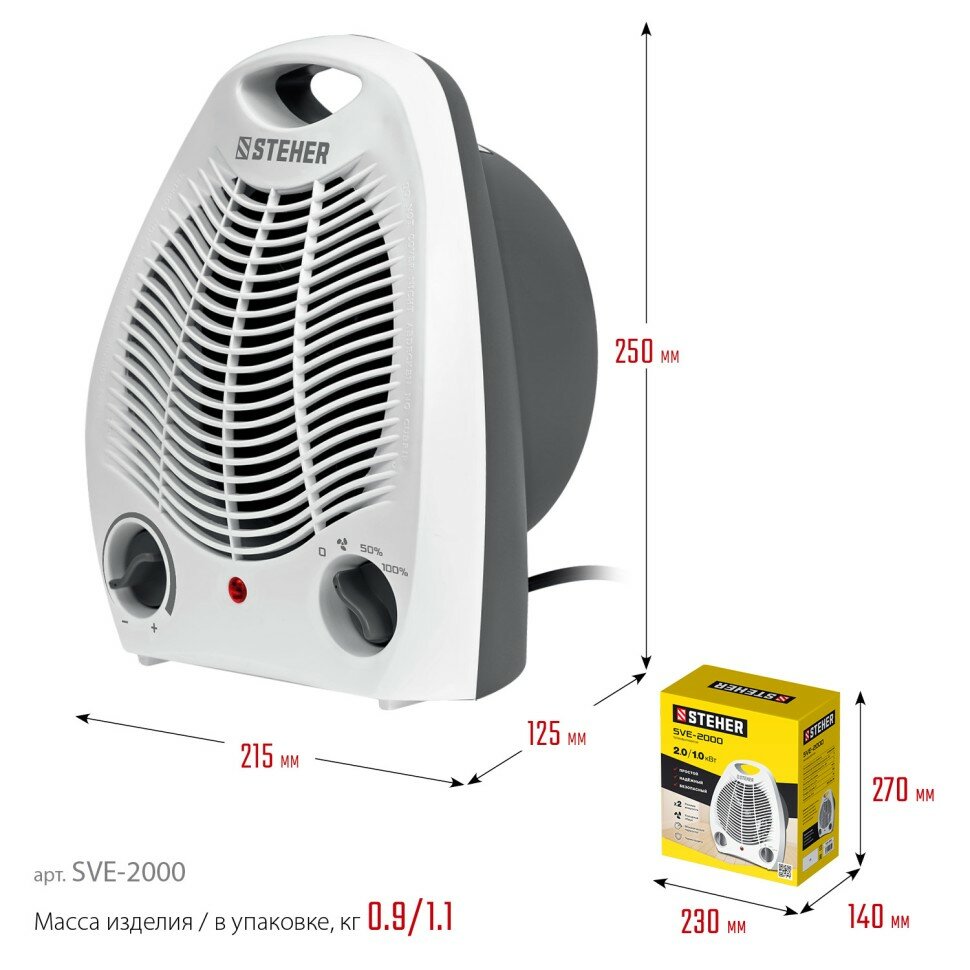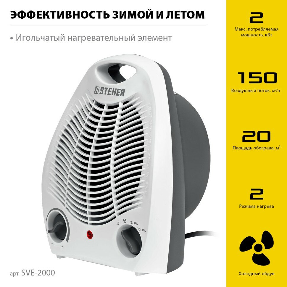 | Дополнительная информация | тепловентилятор, игольчатый нагревательный элемент, 2 режима мощности, функция вентиляции без нагрева, терморегулятор, регулировка температуры, низкий уровень шума, площадь обогрева до 20 м², мощность 2000 Вт, напряжение 220-240 В |