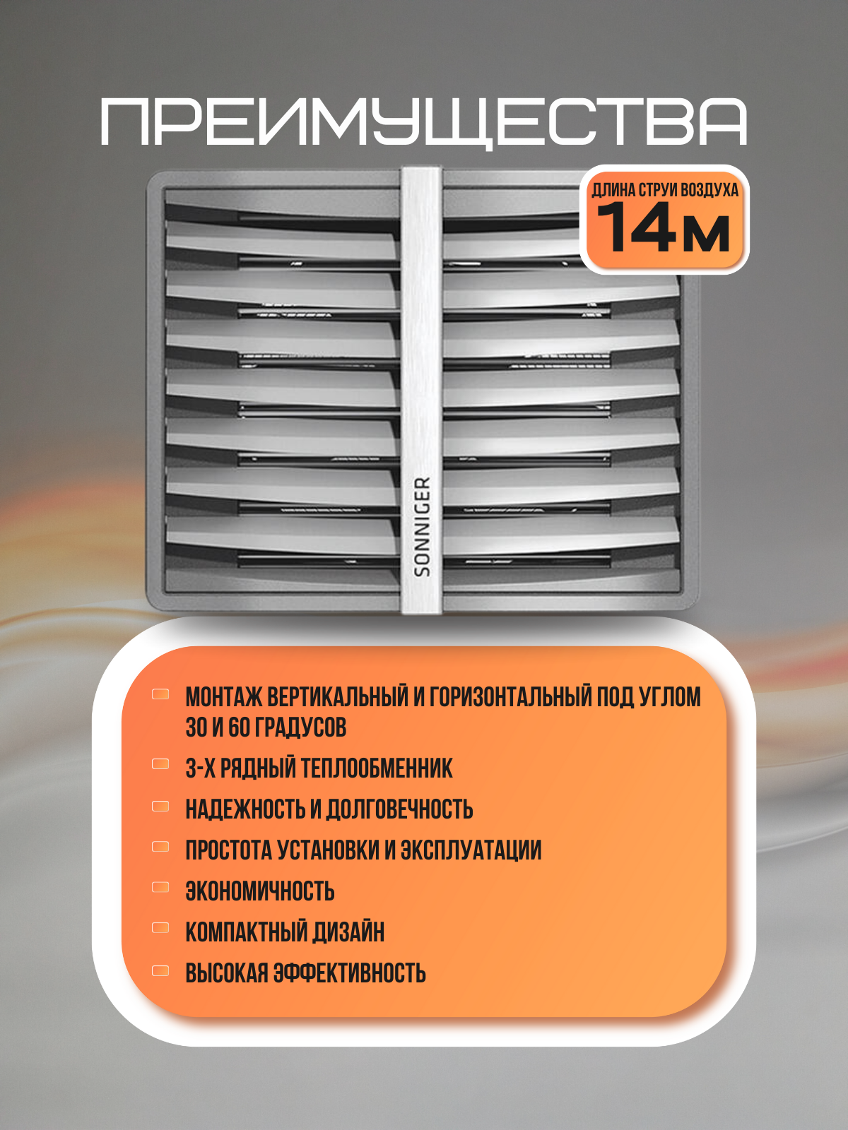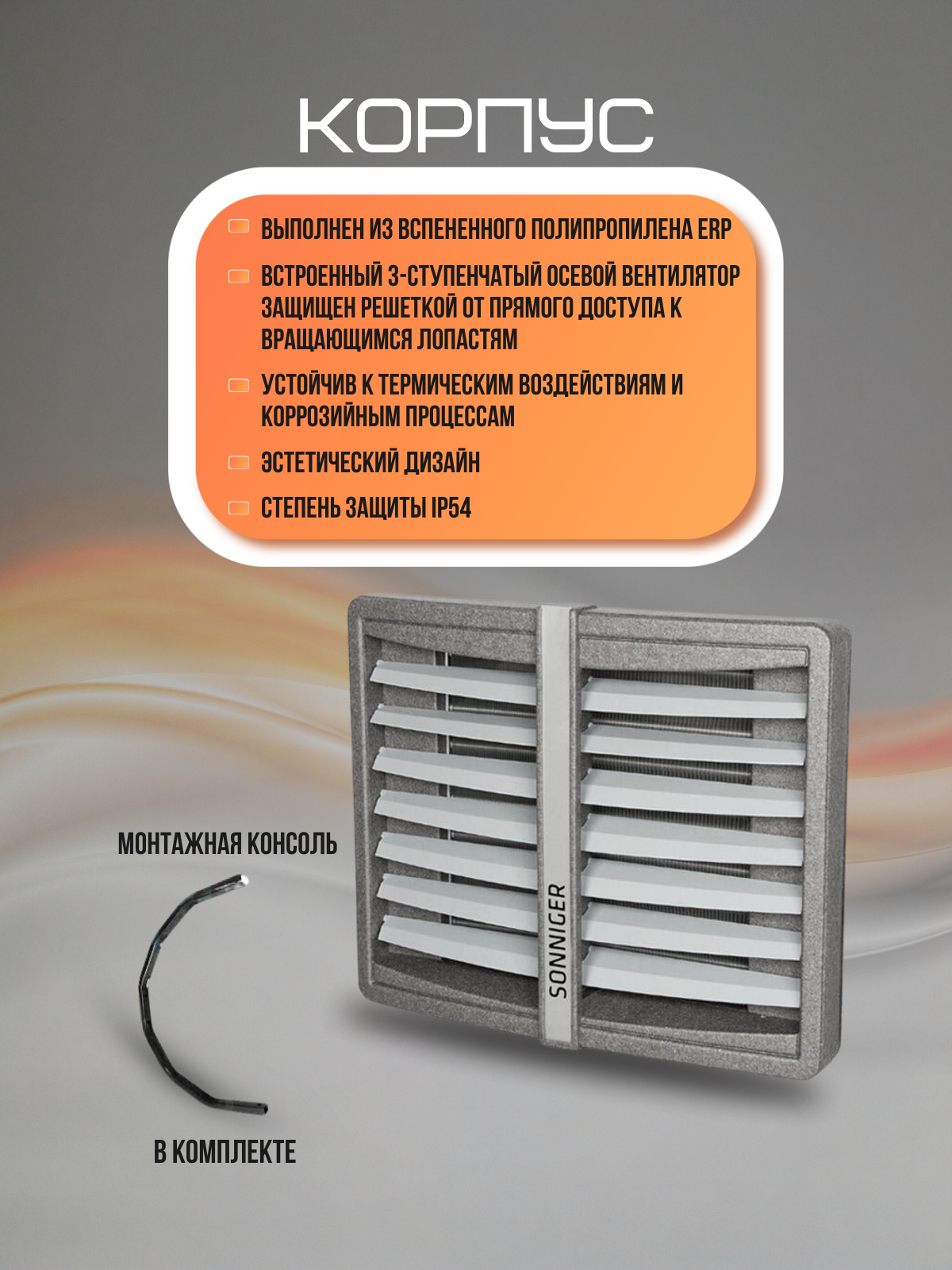 Тепловентиляторы SONNIGER CONDENS ONE – применяеются для качественного и бесперебойного обогрева складских и производственных помещений малого размера. Отопительный агрегат SONNIGER CONDENS ONE способен выдавать 5-25 кВт тепловой энергии, обладая при этом высокой эффективностью и минимальным энергопотреблением. Корпуса линейки тепловентиляторов SONNIGER выполнены из материала под названием вспененный полипропилен, который также известен как EPP. преимущества: - Резкое снижение затрат по сравнению с традиционным водяным отоплением - Эффективная работа на всех скоростях - Энергосберагающий электромотор с классом защиты IP54