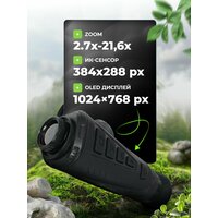 Одна из старших моделей новой серии монокуляров с дальностью обнаружения ростовой фигуры в 1180 метров способна закрыть широкий комплекс задач на ночных типах охот. Прибор построен на передовом сенсоре Vox 384х288 рх, 12 μm и предоставляет качественное термографическое изображение. В окулярном модуле установлен морозоустойчивый дисплей OLED, а линзовая система получила оптическую схему на низкодисперсных стеклах. Также проработан узел диоптрийной корректировки и полностью обновлено программное обеспечение. К услугам пользователей полный набор мультимедийных опций, высокоскоростной модуль Wi-Fi с режимом «Точка доступа» и много других полезных опций. Прочный корпус с прорезиненными броневставками легко удерживается даже в мокрых руках. Прибор готов к работе в условии высокой влажности при широком диапазоне рабочих температур.